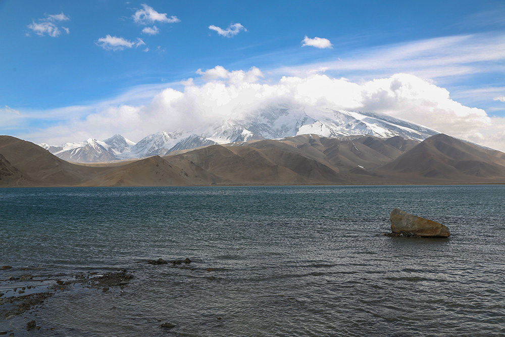 喀拉库勒湖,这里也是慕士塔格峰观赏点,慕士塔格峰位于阿克陶县与塔什库尔干塔吉克自治县交界处,海拔7509米。地处塔里木盆地西部边缘,东帕米尔高原东南部,与周边的7649米的公格尔峰、7530米的公格尔九别峰,三山耸立,如同擎天玉柱,屹立在美丽的帕米尔高原上,成为帕米尔高原的标志和代表。在此湖可以拍摄倒影中“冰山之父”慕士塔格雪峰,但当时风很大、霾很重,按天气预报的说法,这叫“浮尘”。
