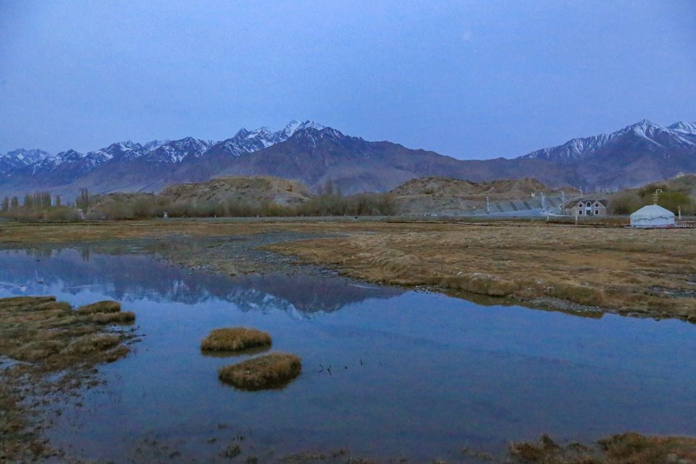 4月3日,早晨8:10前往阿拉尔金草滩湿地,本来可以以高原湿地为前景、古石头城为中景、雪山为背景,拍摄一张塔什库尔干县城最精华的照片——神山脚下的石头城,但遗憾的是,等了一个多小时没有日出,无望而归。今天的目的地是库科西鲁克乡瓦窑本村。