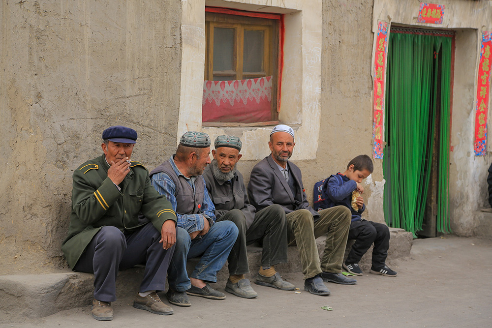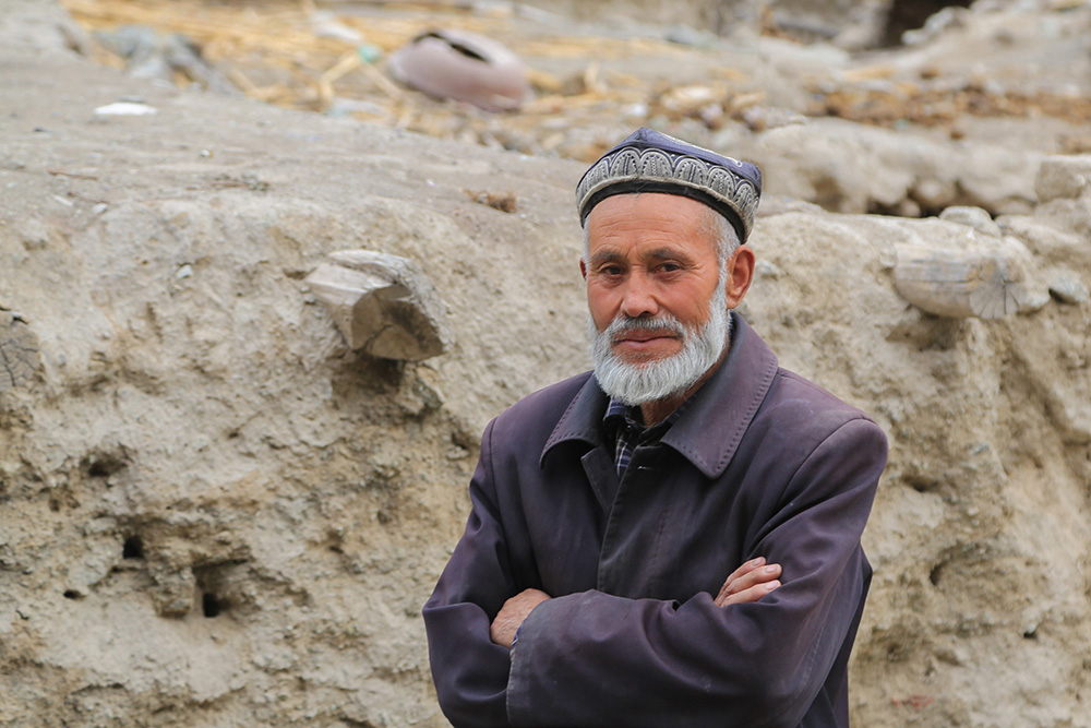 小同村,依然是没花没人,村里房子拆光了,像是一个工地。还好,找到一家进行了家访,这家当时有老大爷、老奶奶和儿媳妇在家,他们都听不懂汉语,儿媳妇一直在忙活着做馕;老奶奶在屋里走来走去找东西,最后拿出一些药、倒了杯水,给在外面床上坐着的老爷爷送去。老爷爷一看我们给他拍照,就想搂着老婆照一张,老奶奶很果断地拒绝了。