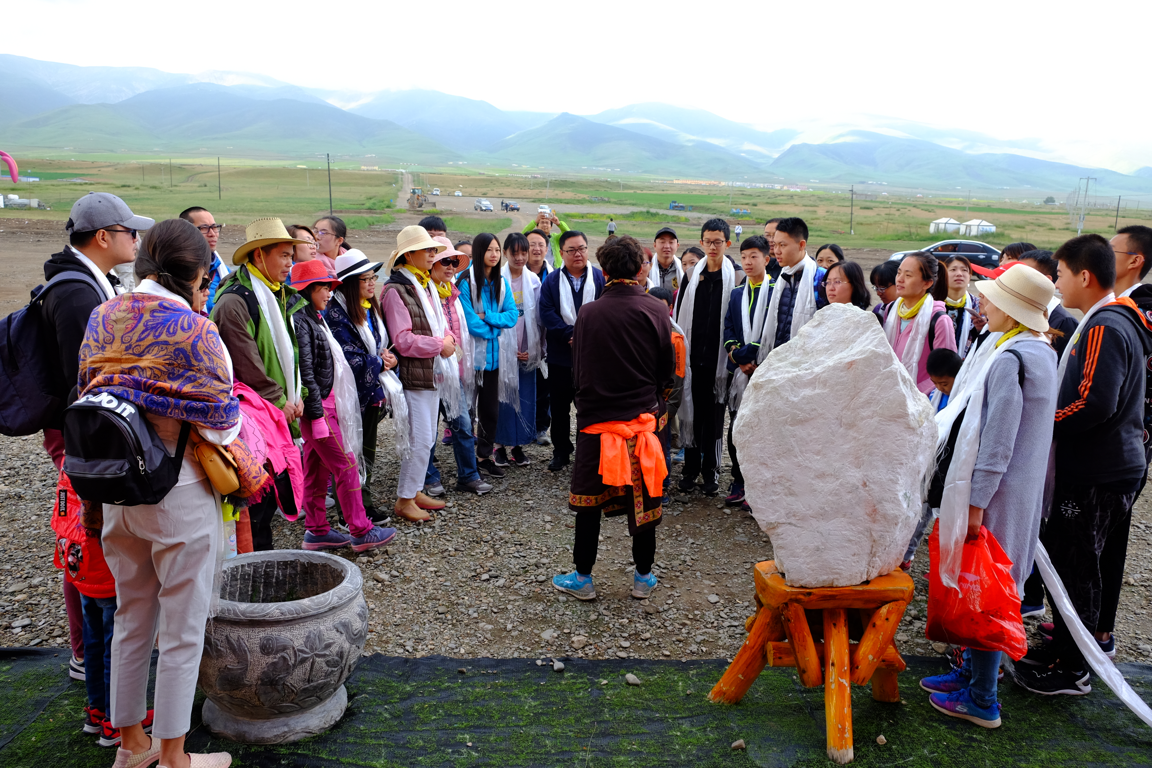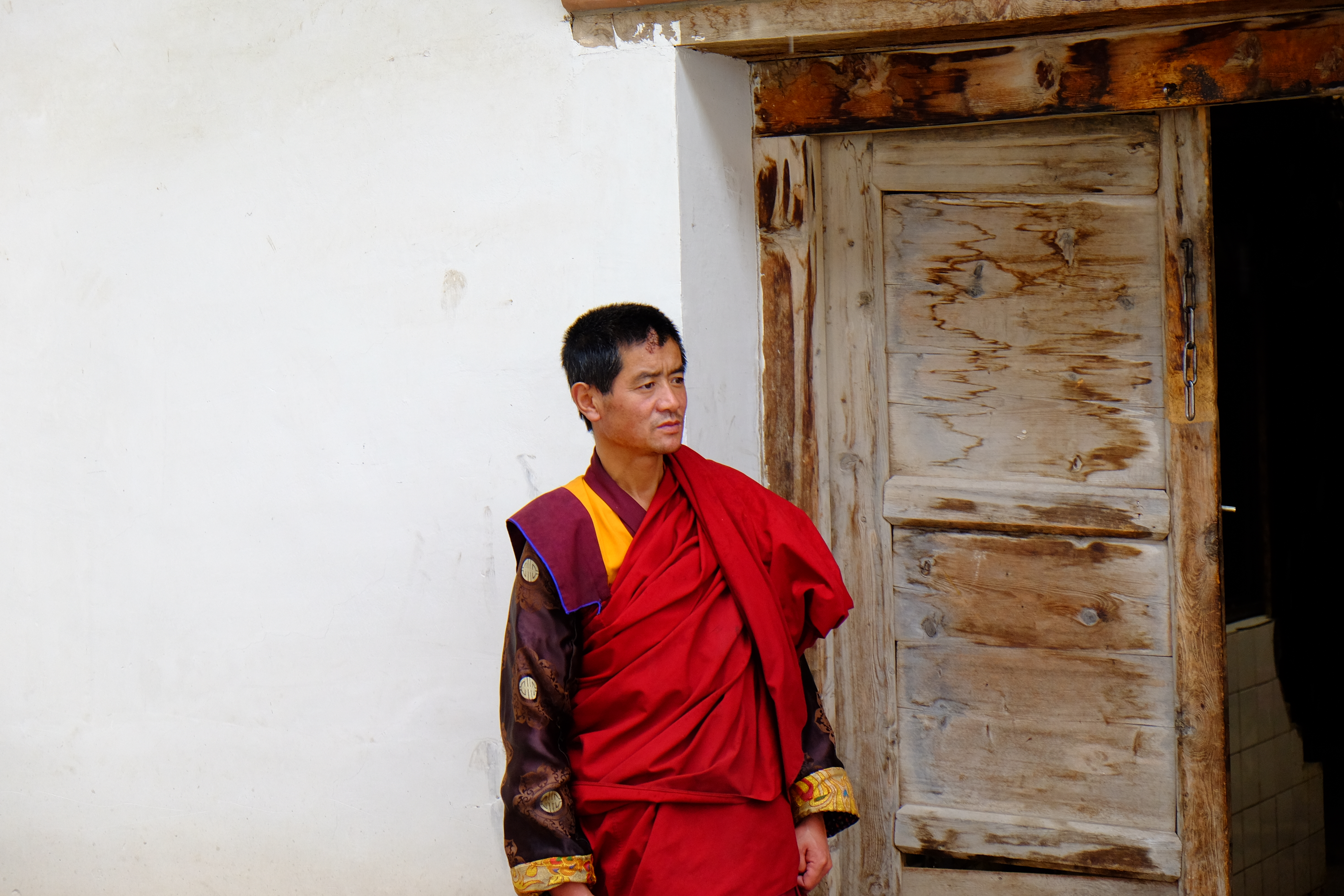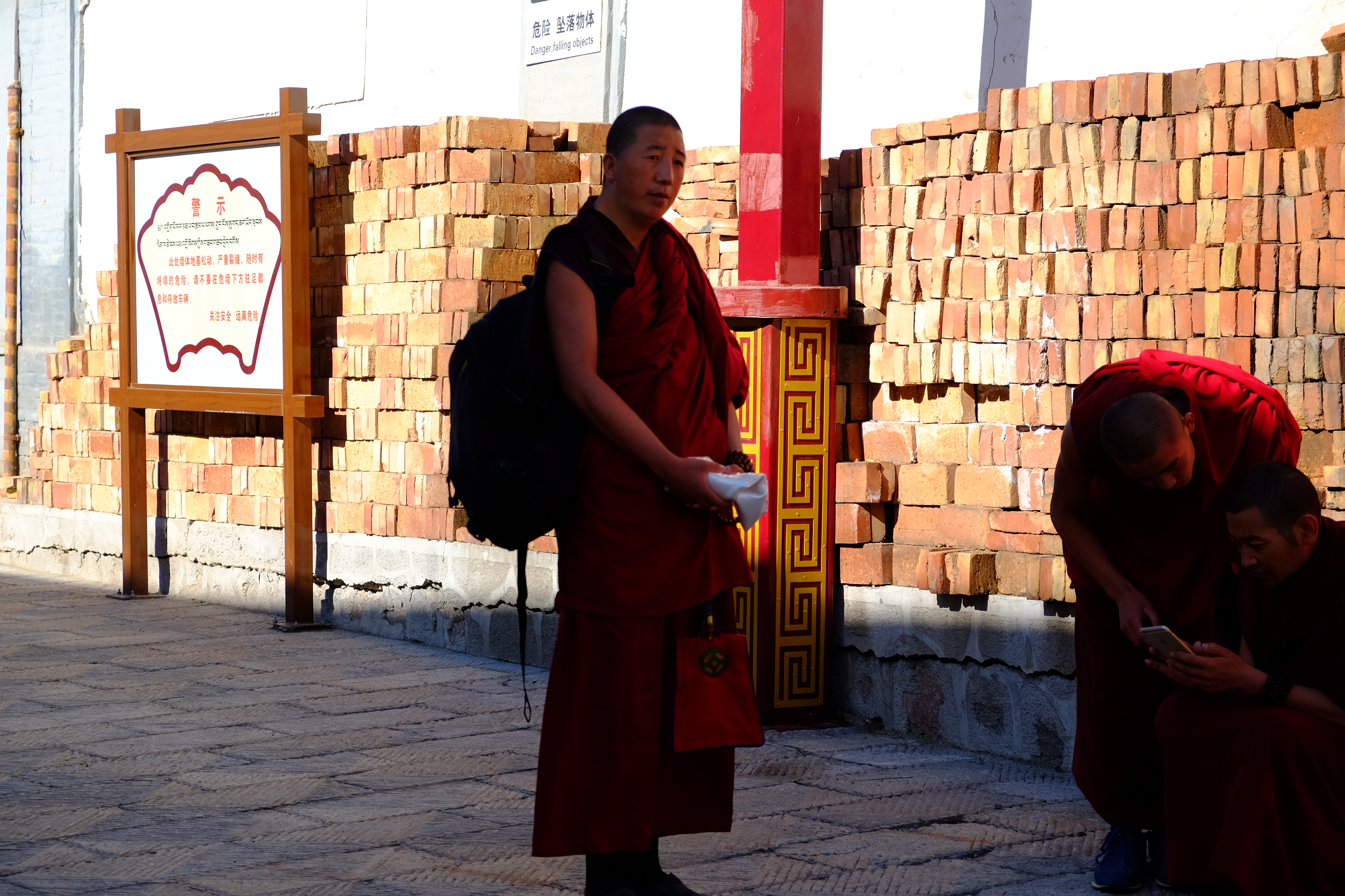 在阿柔大寺门前,听喇嘛传诵经文;