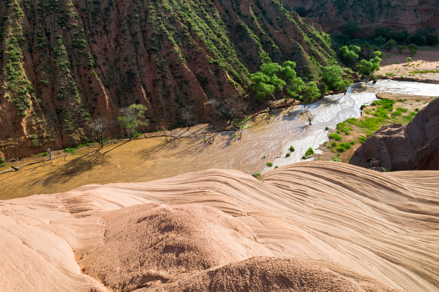 位于距陕西省靖边县东南22公里处龙洲乡的闫家寨子,俗称闫寨子。靖边波浪谷岩石叫红砂岩,学术上被称为"砒砂岩",成于古生代二叠纪和中生代三叠纪、侏罗纪、白垩纪之间。与美国的亚利桑那州的波浪谷几乎在同一纬度的对称点上,成为绝美丹霞地。