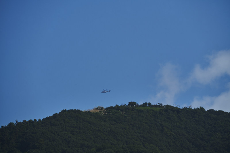 正在海滩上拍照,听到头顶轰鸣之声,抬眼望去,是一架直升机从旁边山顶飞过。记得以前在东庙子湖岛上看到过直升机停机坪,后来上白沙岛后也看到了停机坪。