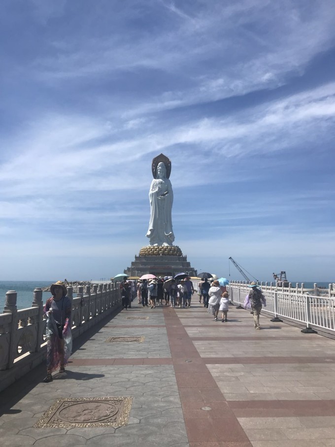 远远望去一尊108米高通体圣白的观音伫立在蔚蓝的 南海 中,一条通往观音坐台的朝圣道宛若仙界的大门,站在观音脚下,抱住大大的佛脚,心灵非常的祥和宁静,世间罪恶离我们远去,留下的是善良与真诚。