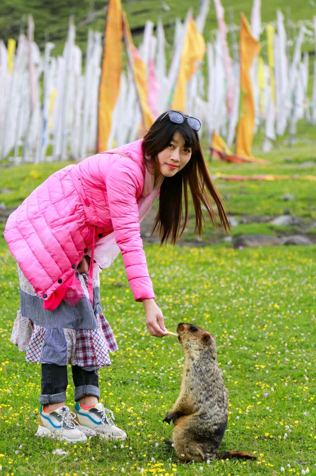 由于下雨大家也没有徒步到山上去,只是在村后的半山坡玩耍,格西是藏族人,他比较会逗土拔鼠,可能土拔鼠会听藏语吧,格西还帮我们拍照,格西在帮我拍照的时候被娥子拍到的画面真是有点螳螂捕蝉黄雀在后,哈哈哈。格西人是真不错!跟他说什么他都说好的好的,很开朗幽默不时地跟我们开玩笑,他和文哥一路都跟随着我们一起玩,帮我们背包、带路什么的,包括跟我们上华尖山,九顶山。相对比我去这么多次川西请的几个司机来说我对格西是最满意的。