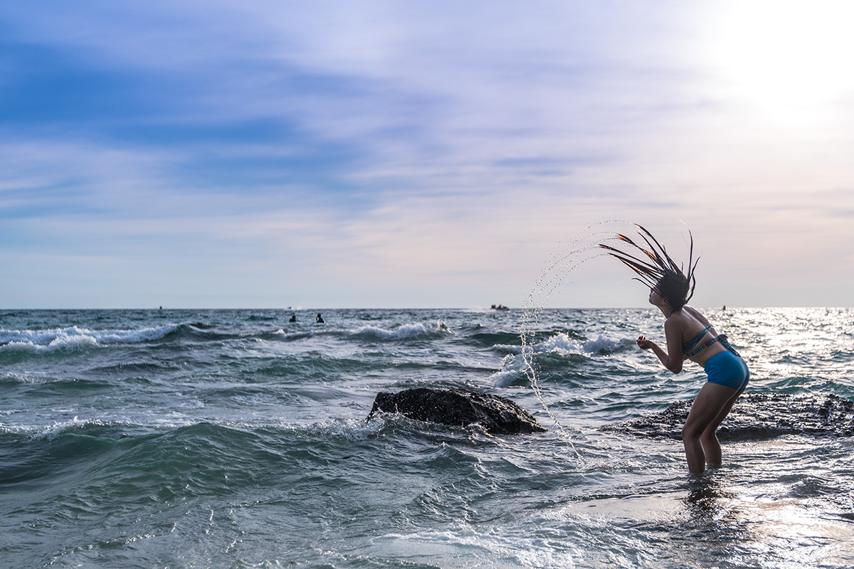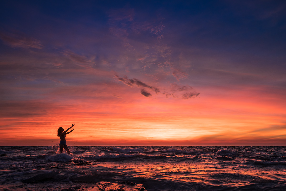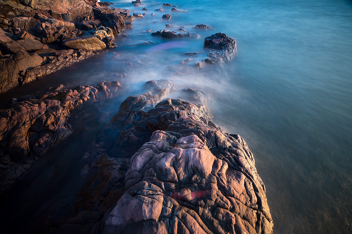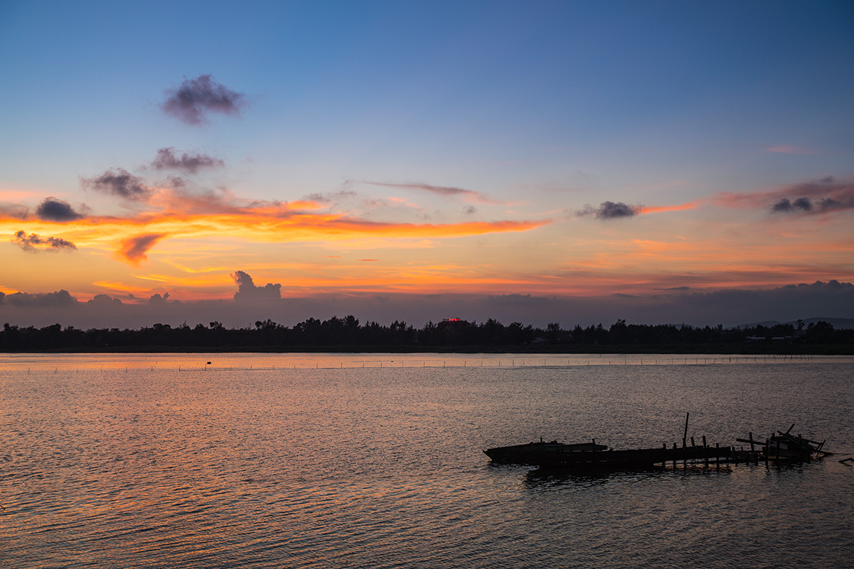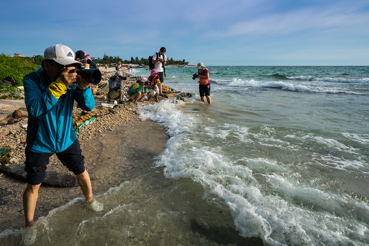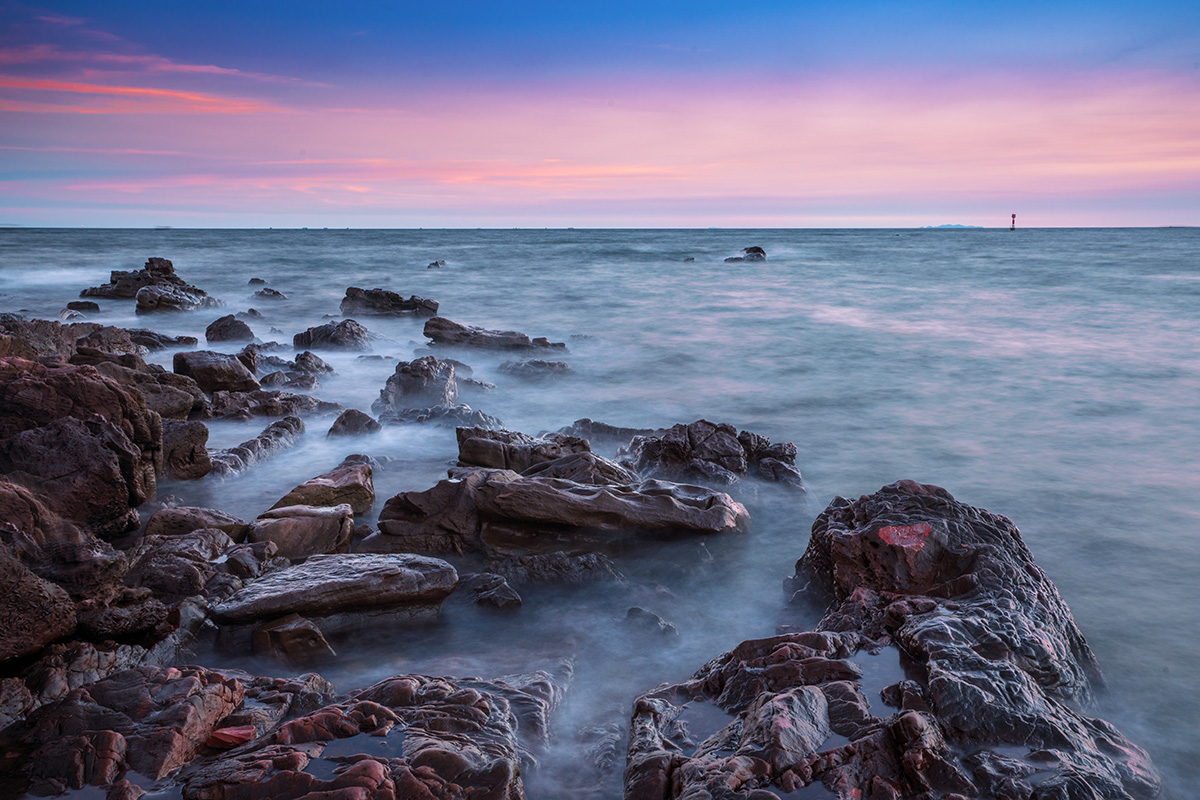 台风“天鸽”登陆前夕,我们登上了涠洲岛。原行程计划,上岛当天傍晚是到火山石地质公园的。考虑第二天将遭遇台风,我决定趁着还有太阳先拍海滩日落。当天刚到石螺口海滩时天空还有点灰,但是意外的是日落之后天空被烧得通红,海面上也如奔腾的钢水。