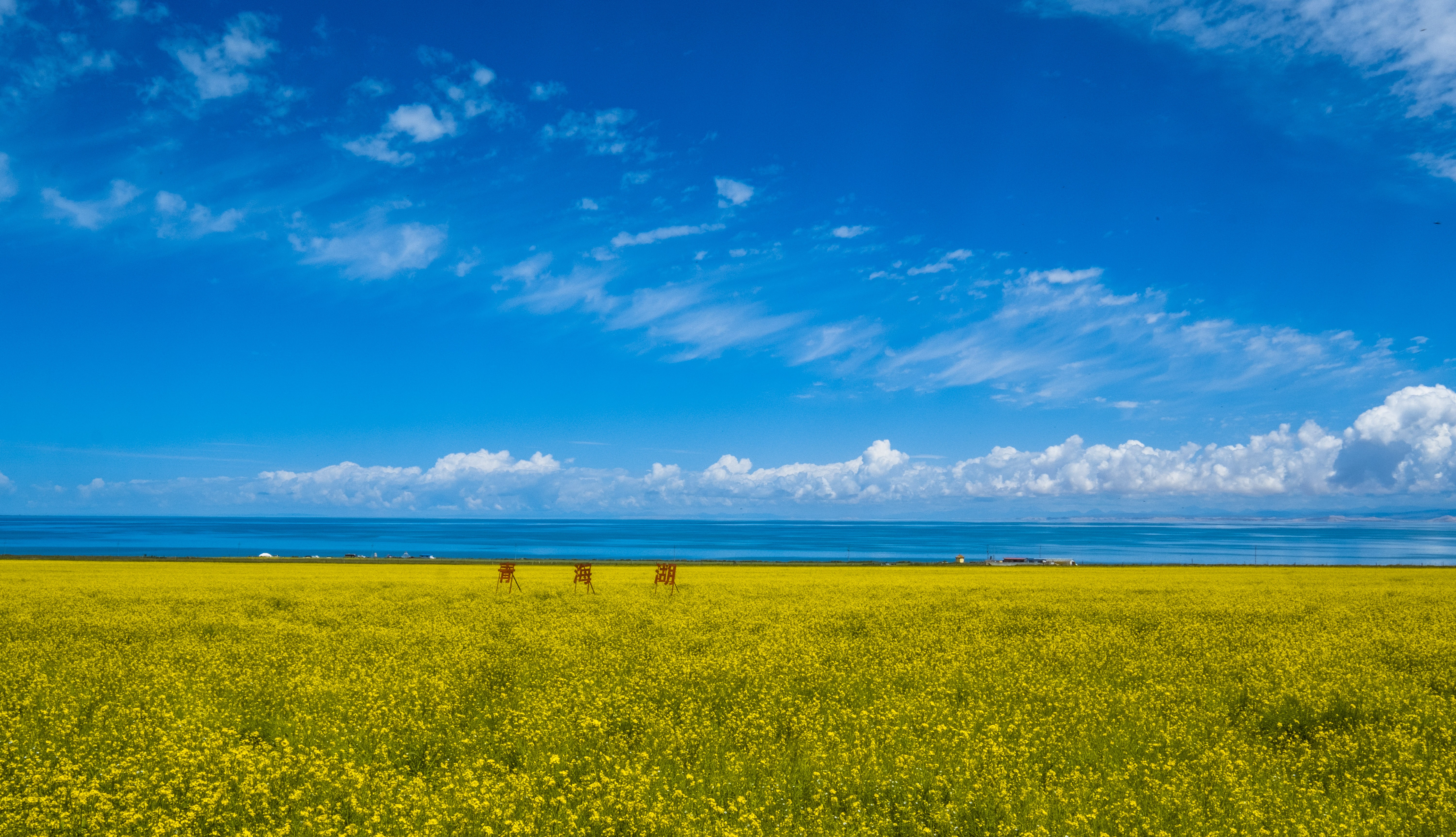 记得当年搭车从青藏线路过的时候住在黑马河,那时没有那么多游客,青海湖的日出也只是匆匆一过,也不知道在哪能看到青海湖的全景。出发当天还是阴雨绵绵从拉脊山下来之后青海湖放晴,蓝天白云大家都非常欣喜能看到这么美的青海湖,青海湖的湖水在蓝天的倒映下呈现出蓝宝石般的颜色,配上油菜花的金黄色真的是美不胜收。