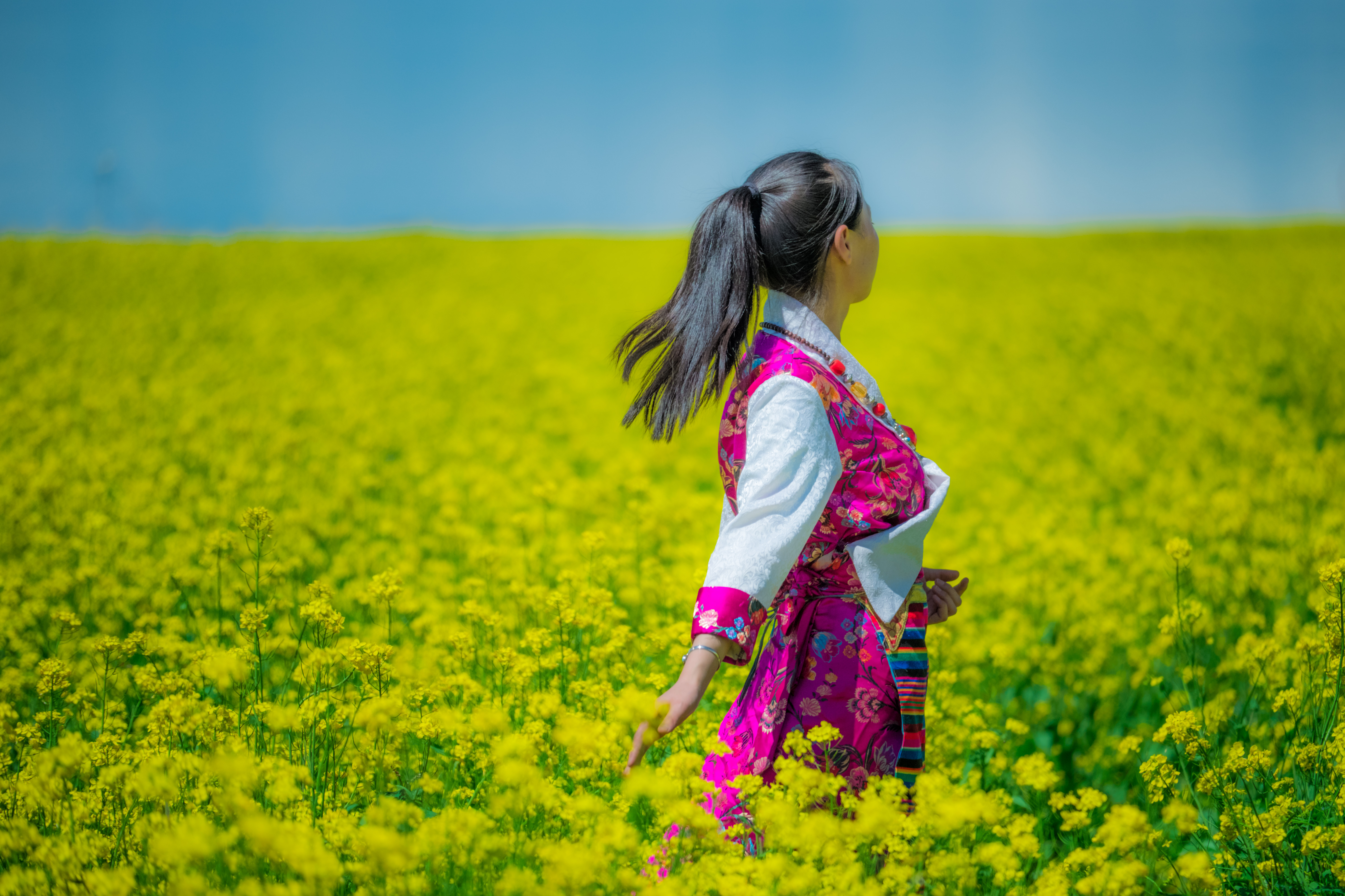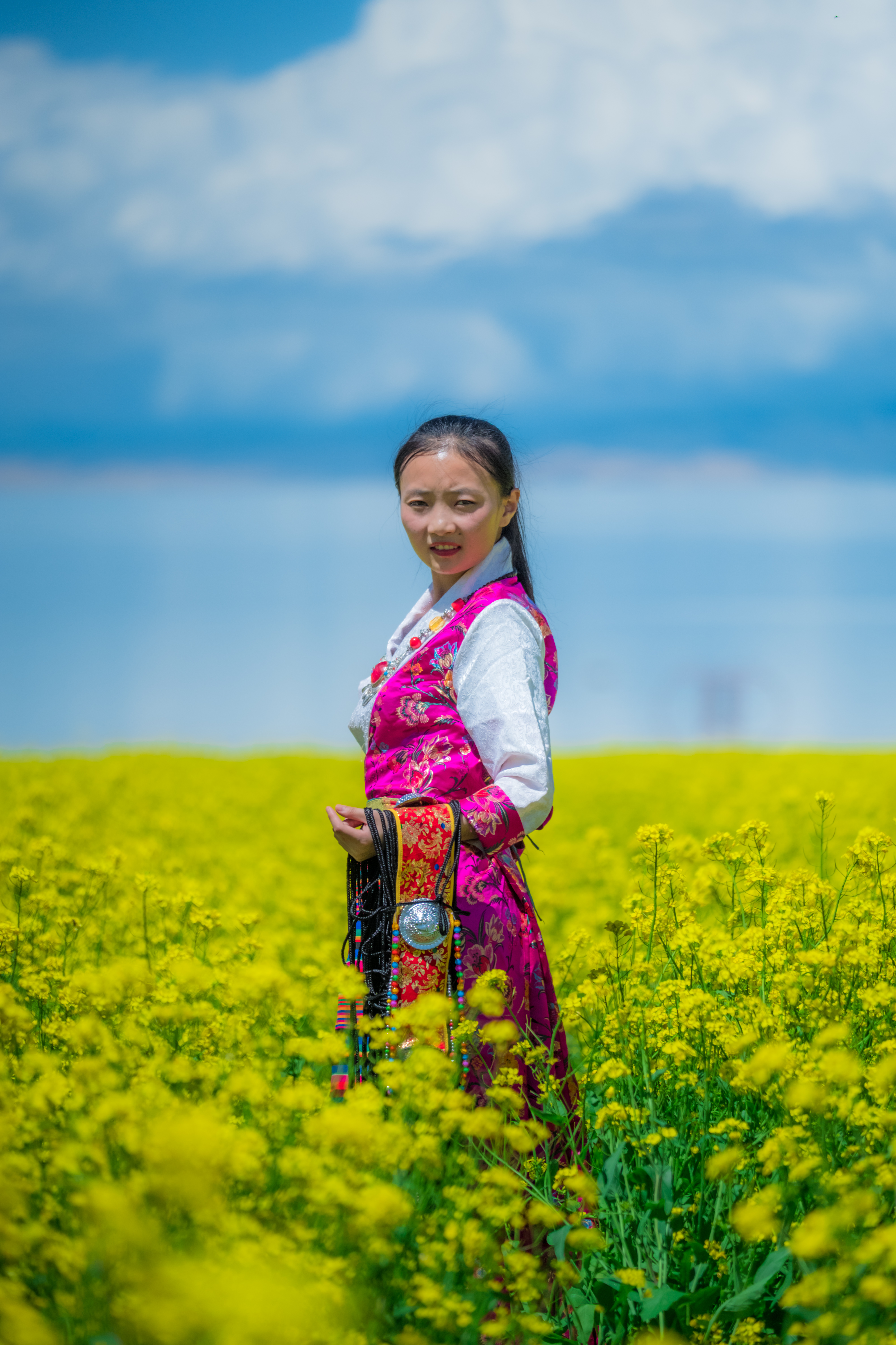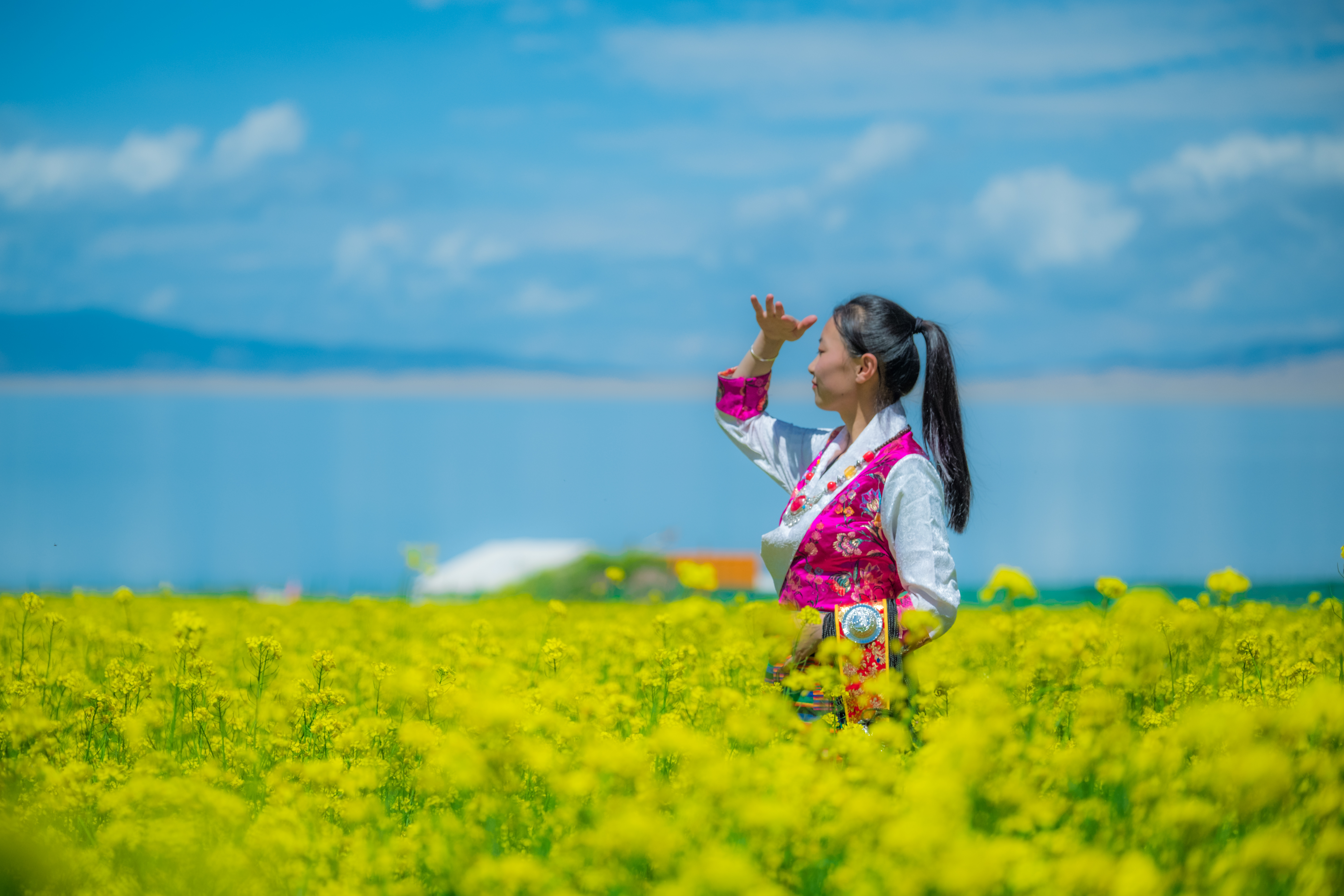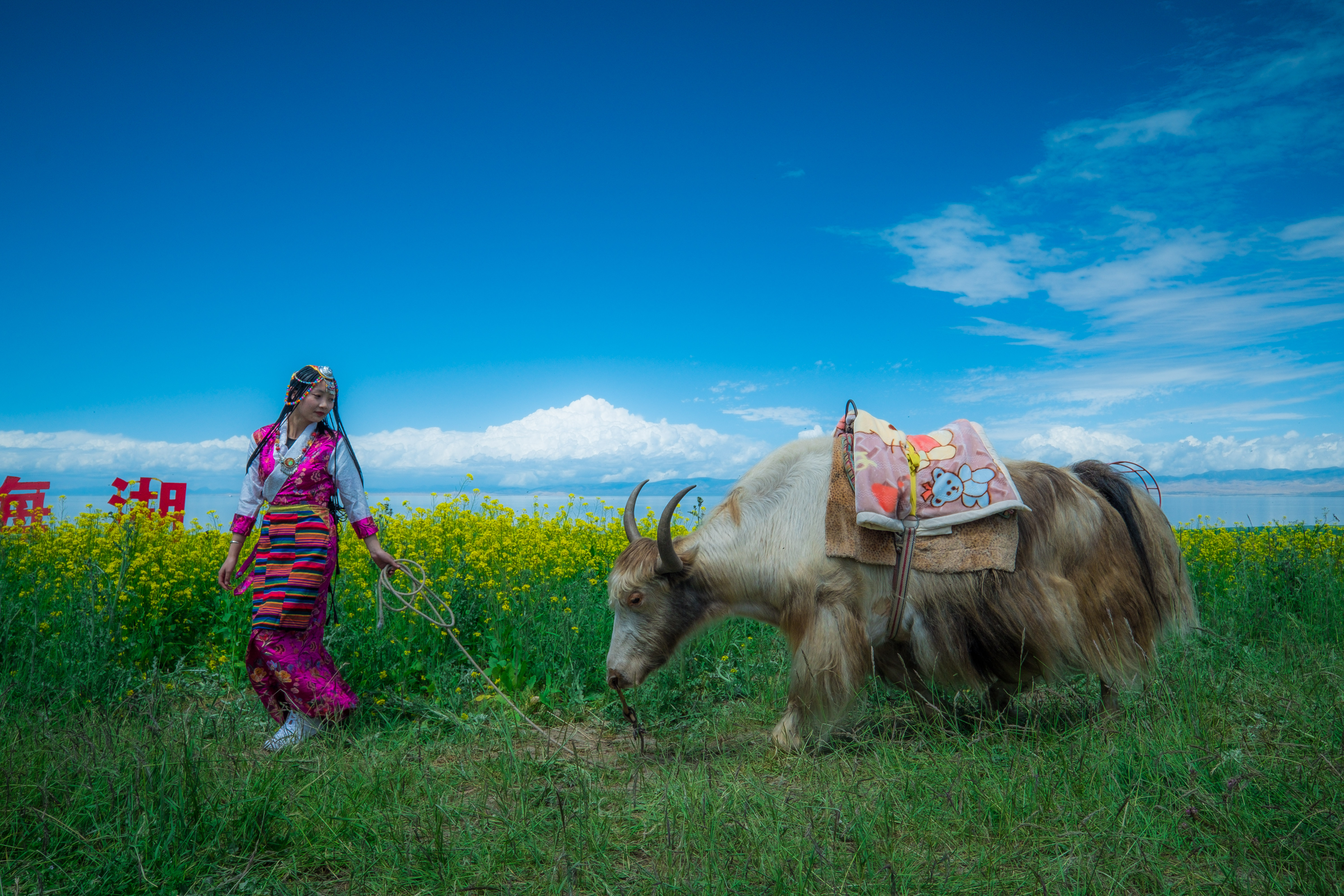 来到青海湖怎能不在金灿灿的油菜花来一组人像拍摄呢,蓝天白云下藏族姑娘在油菜花海自由的玩耍,仿佛置身在金色童话世界。找一片无人的油菜花海,牵着可爱的牦牛时不时回头看一下,俏皮又可爱!