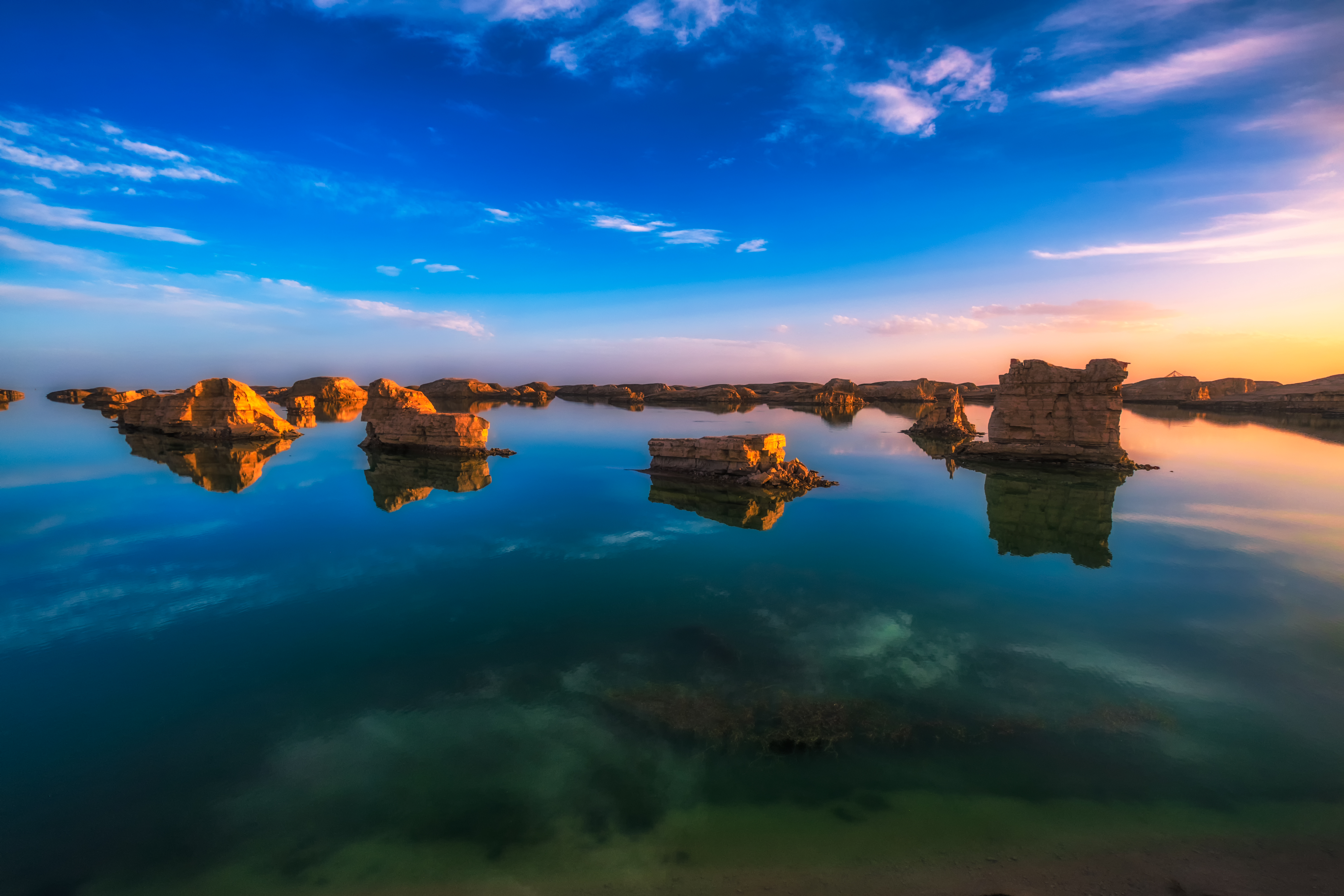 公路大片拍完我们来到了水上雅丹,水上雅丹也是最近几年才被发现和开发的地方,很多地方都还是原生态没有被破坏,一排排雅丹地貌浮现在水面之上,感觉就像西海舰队正在停港休息准备下一次的远征。奇异的沙丘造型,独特的地理地貌,瞬息万变的沙漠气候,更让魔鬼城的称谓显得名副其实。夕阳西下,阳光打在雅丹地貌,湖水随着光线的变化也呈现出不同的颜色,最后的晚霞也是那么的迷人!