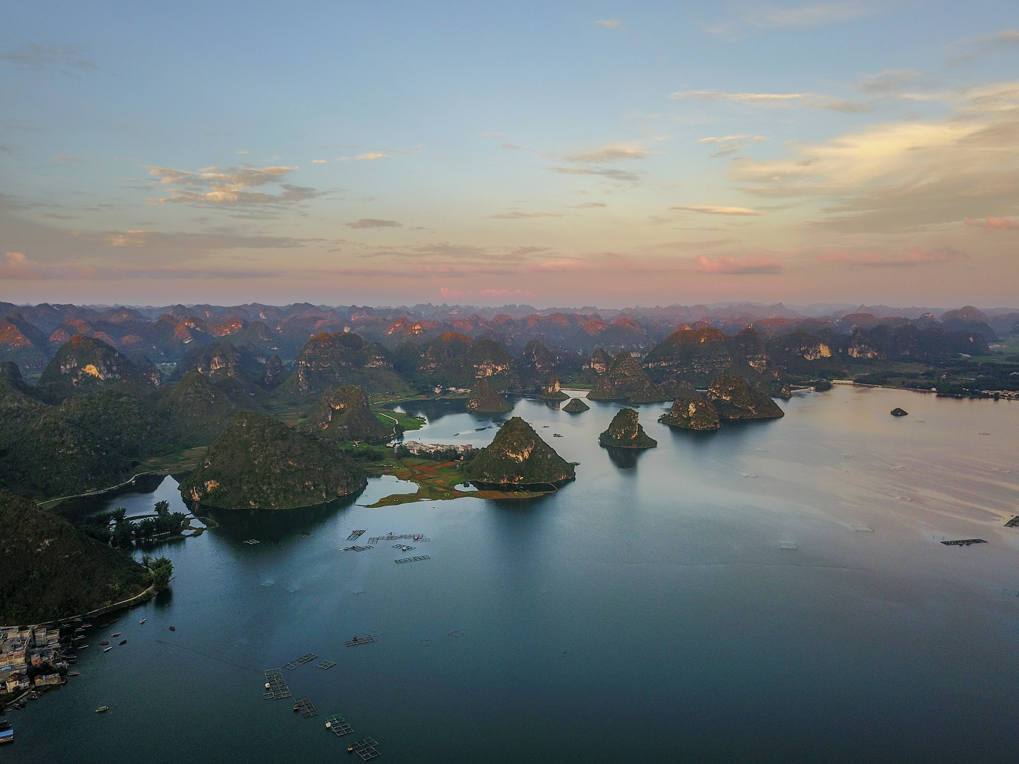 这个点是此行的一个亮点,团友们听都没听过的一个地方,就连经常跑旅游团的司机师傅也说来了靖西这么多次也从来没有听说过这个地方,但是风景却绝美,天气正好,日落时分,漫天通红,湖水倒影着夕阳,我们乘坐游船慢慢欣赏,惬意至极。