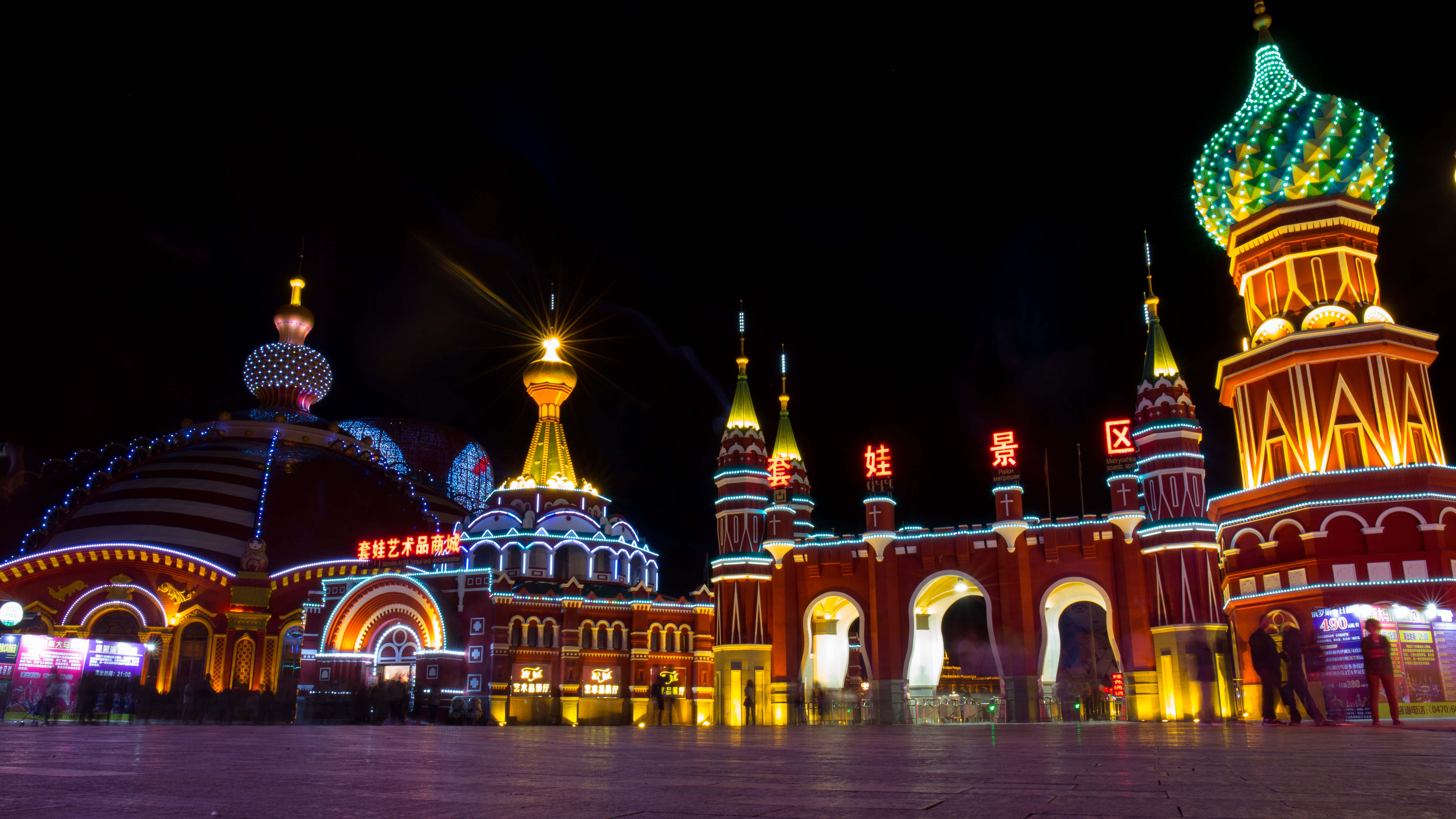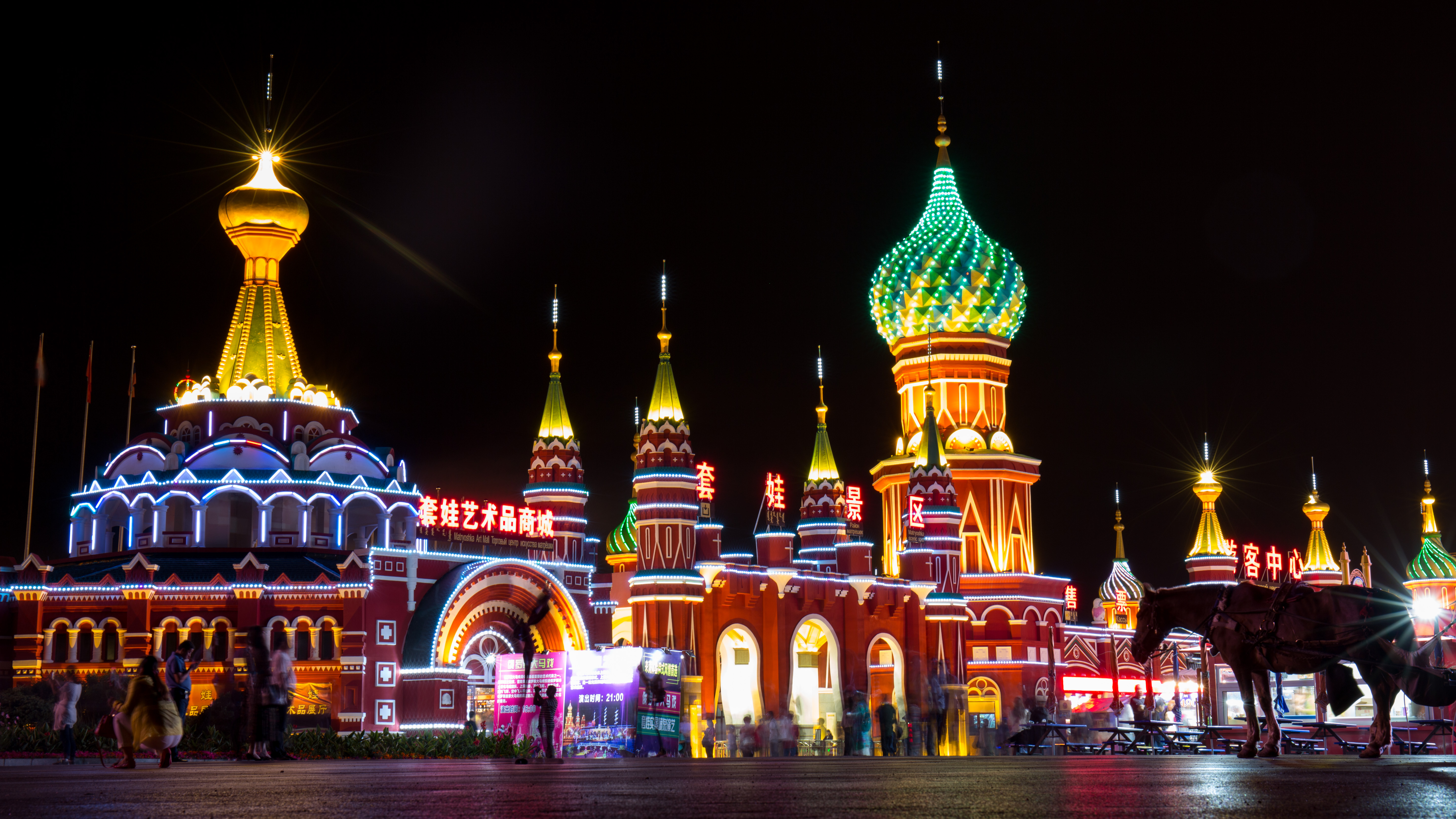 晚上的套娃广场更加有魅力,这里的建筑充满了异国情调,造型奇特,色彩缤纷,世界上最大的套娃就在这里,高达30米