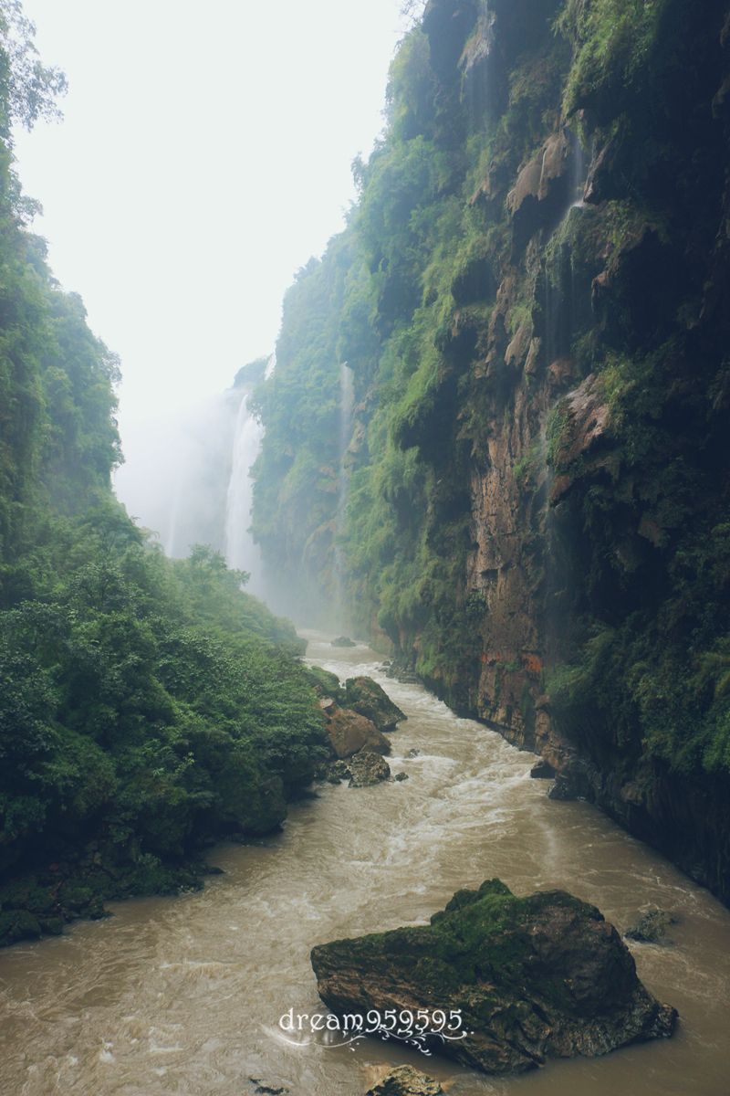 早上雾气比较重,间歇性的下点雨,不过这对于游玩峡谷来说并没有什么影响,因为本来也到处滴着水,或是水帘洞。只是瀑布下没有了彩虹。