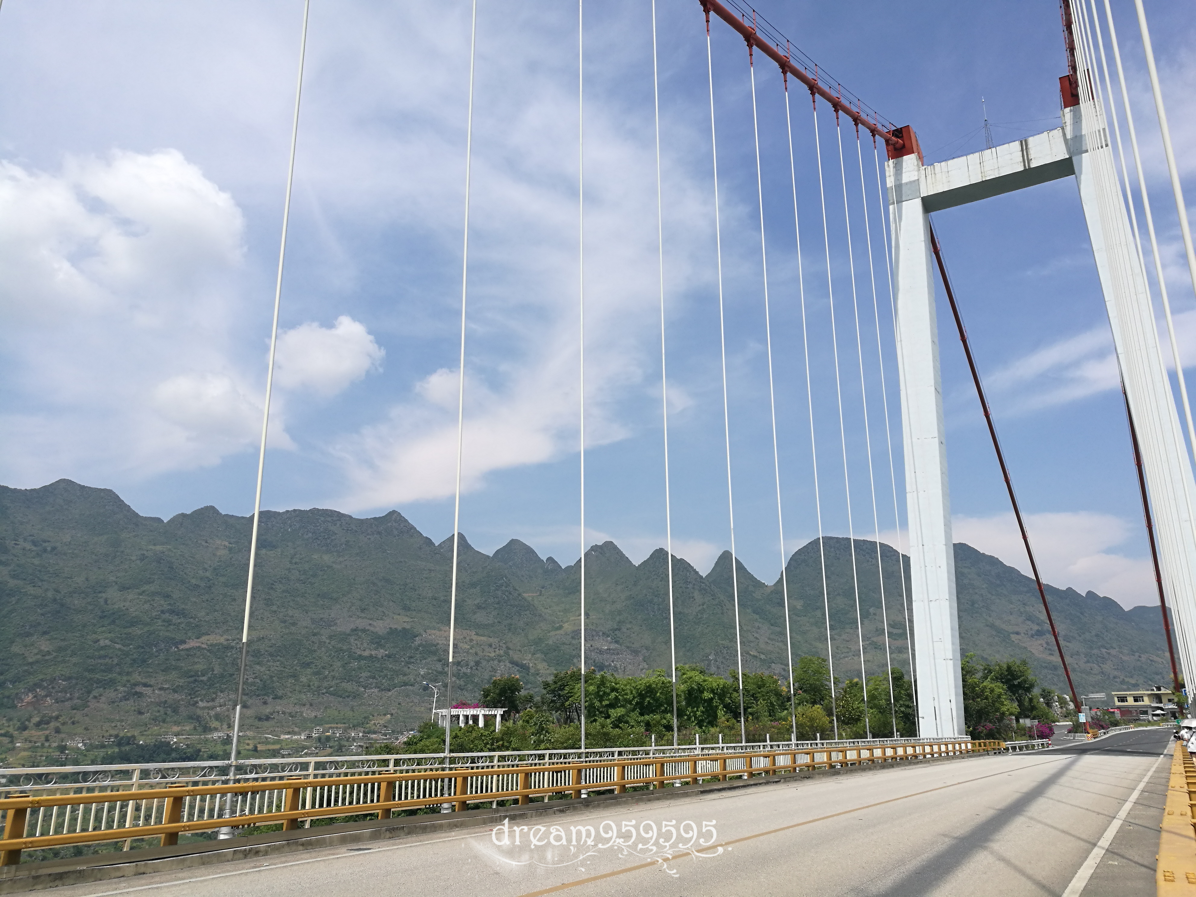 这是个路边景点,站在北盘江大桥上往下看,大山的裂痕,青山绿水,蓝天白云,着实不错。