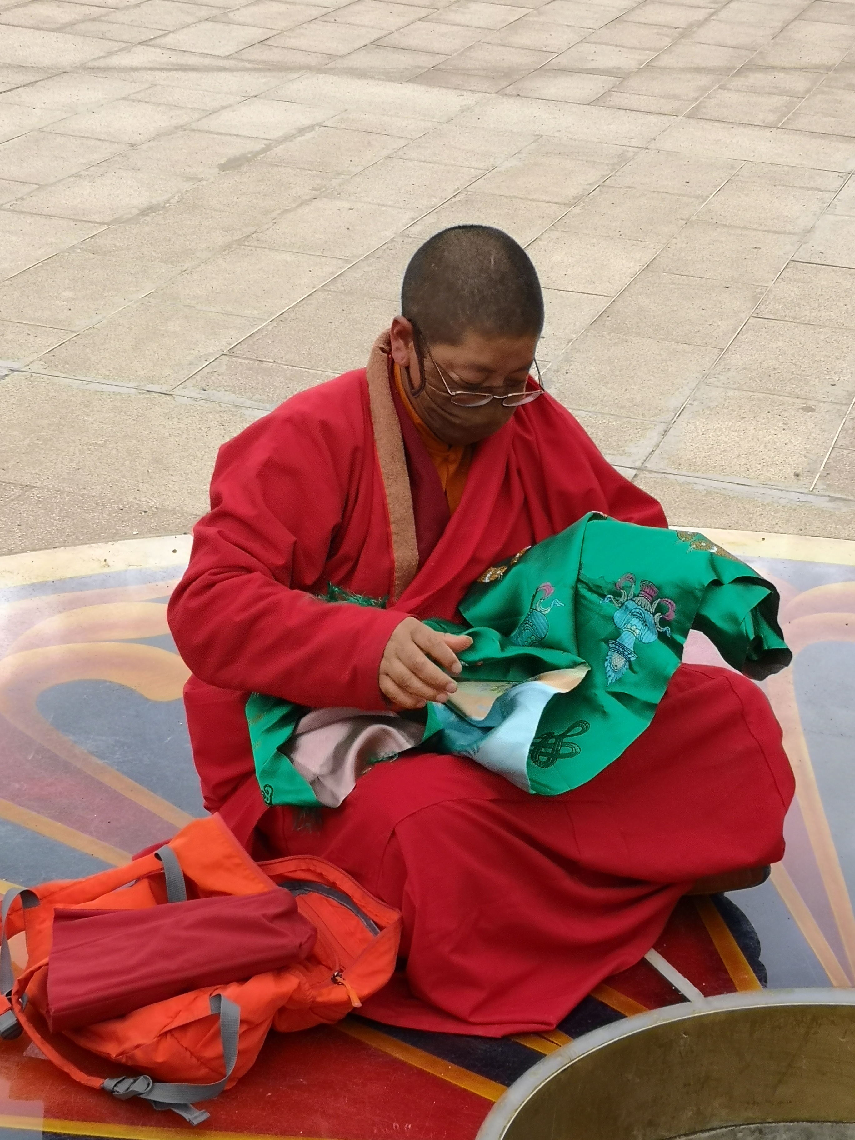 色达天葬台前,一位觉姆(女僧人)为一只麻雀诵经超度 。