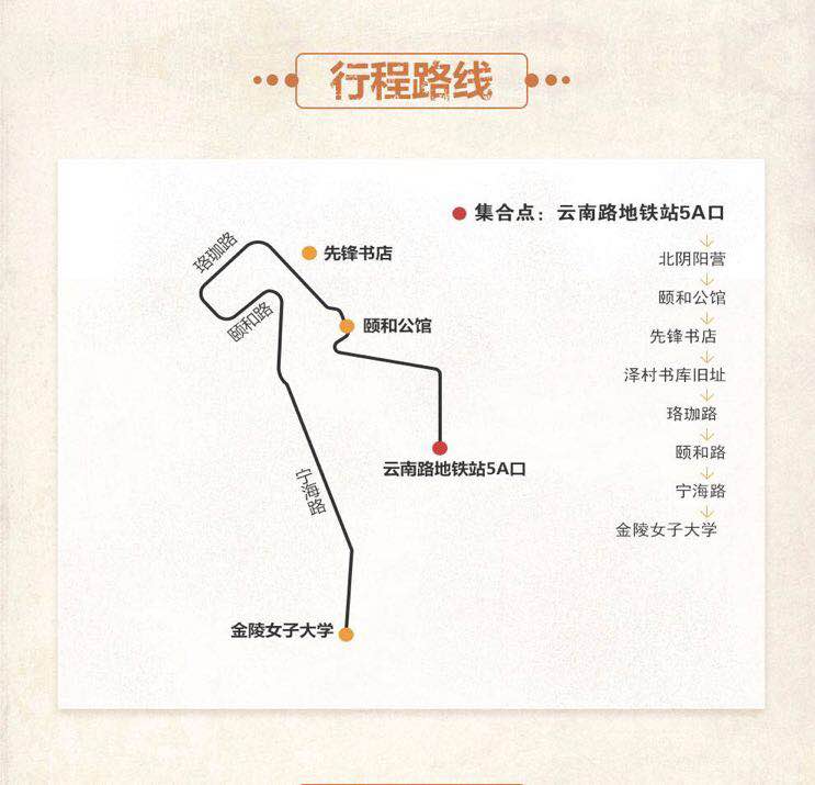 云南路地铁站5A口——北阴阳营——南京的香港街——颐和公馆——先锋书店——泽存书库旧址——珞珈路——宁海路——金陵女子大学