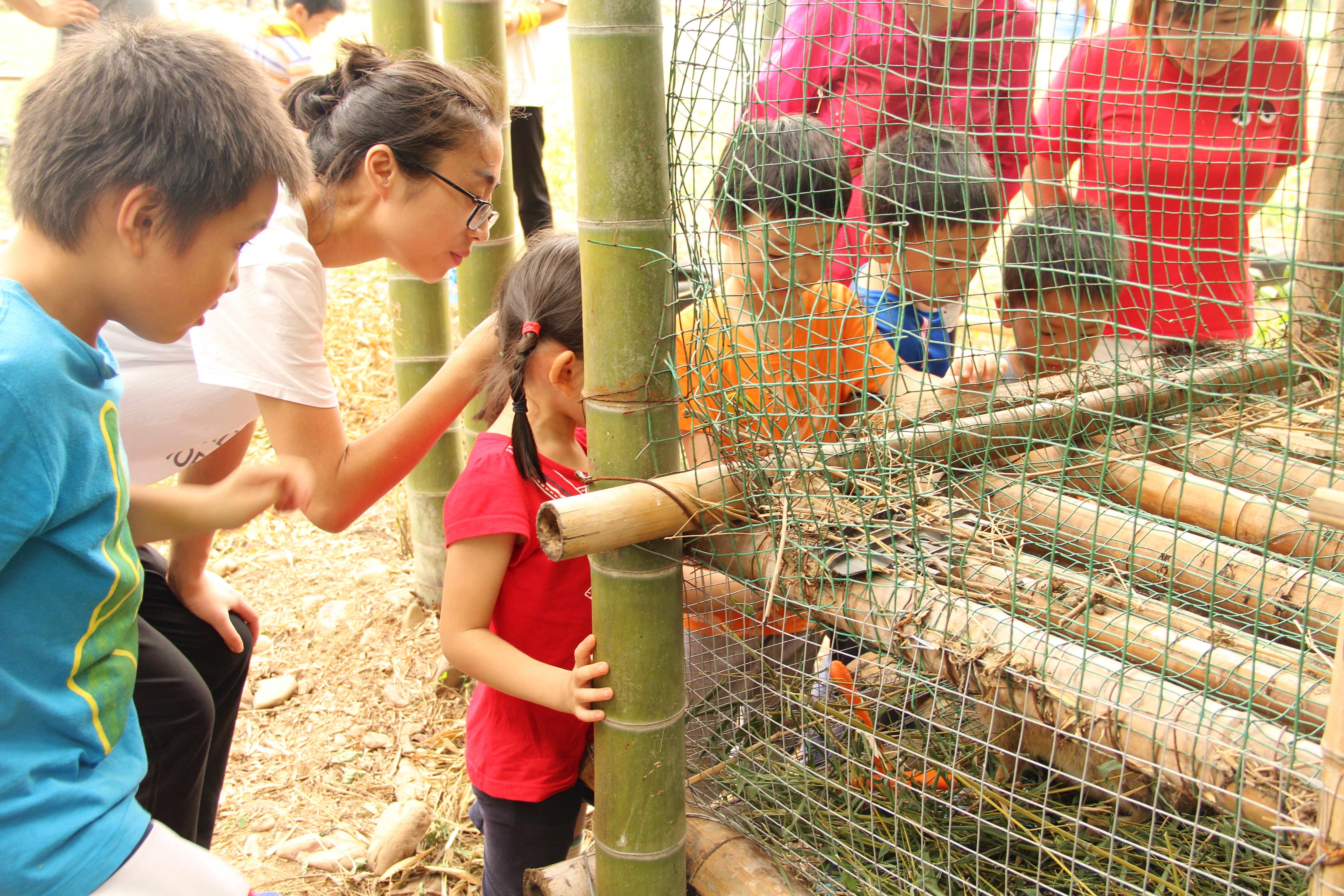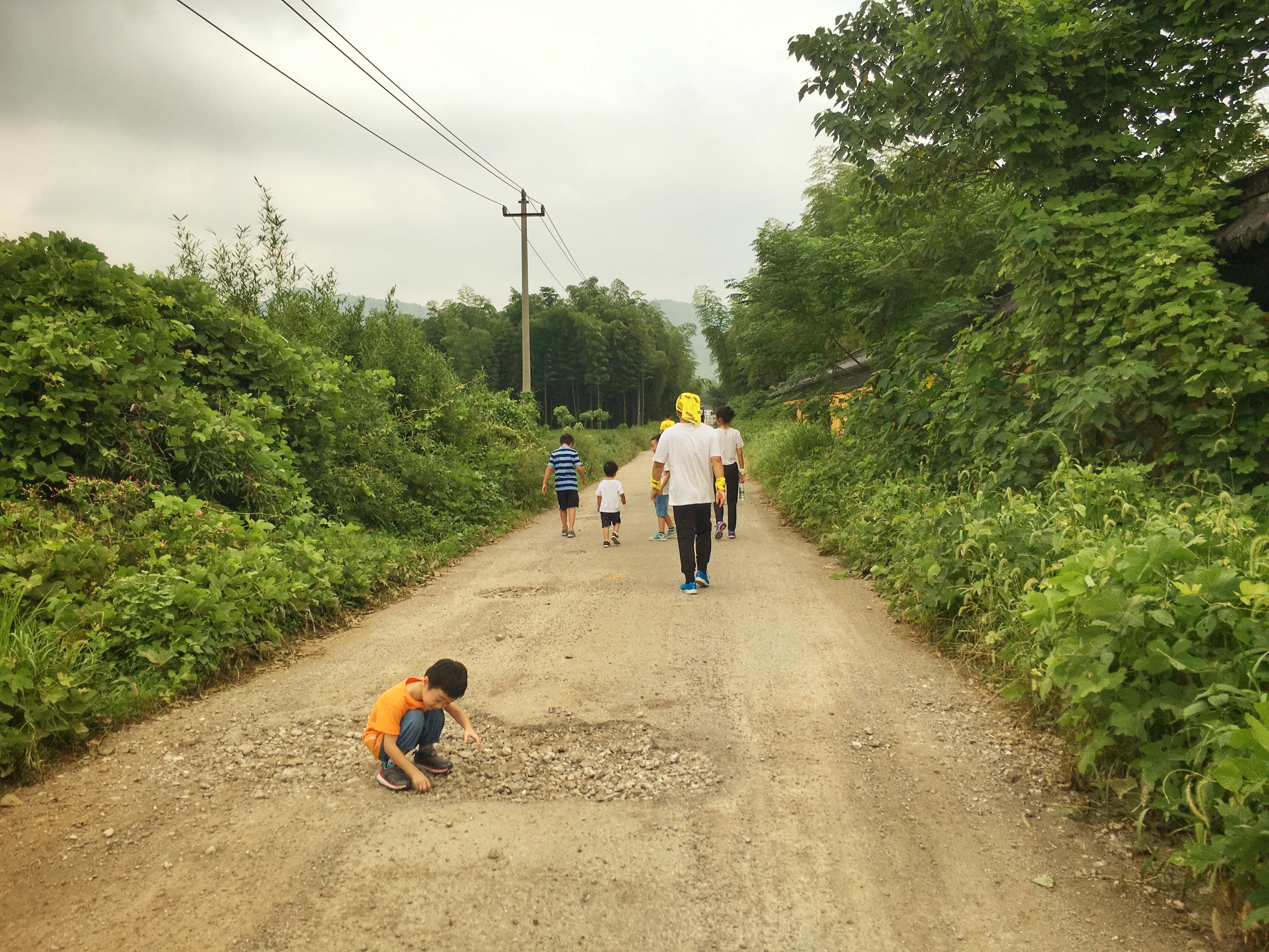 恩,小坡会有些陡峭,豆浆大大打头阵。小朋友在农家老板的照看下小心翼翼地下坡。