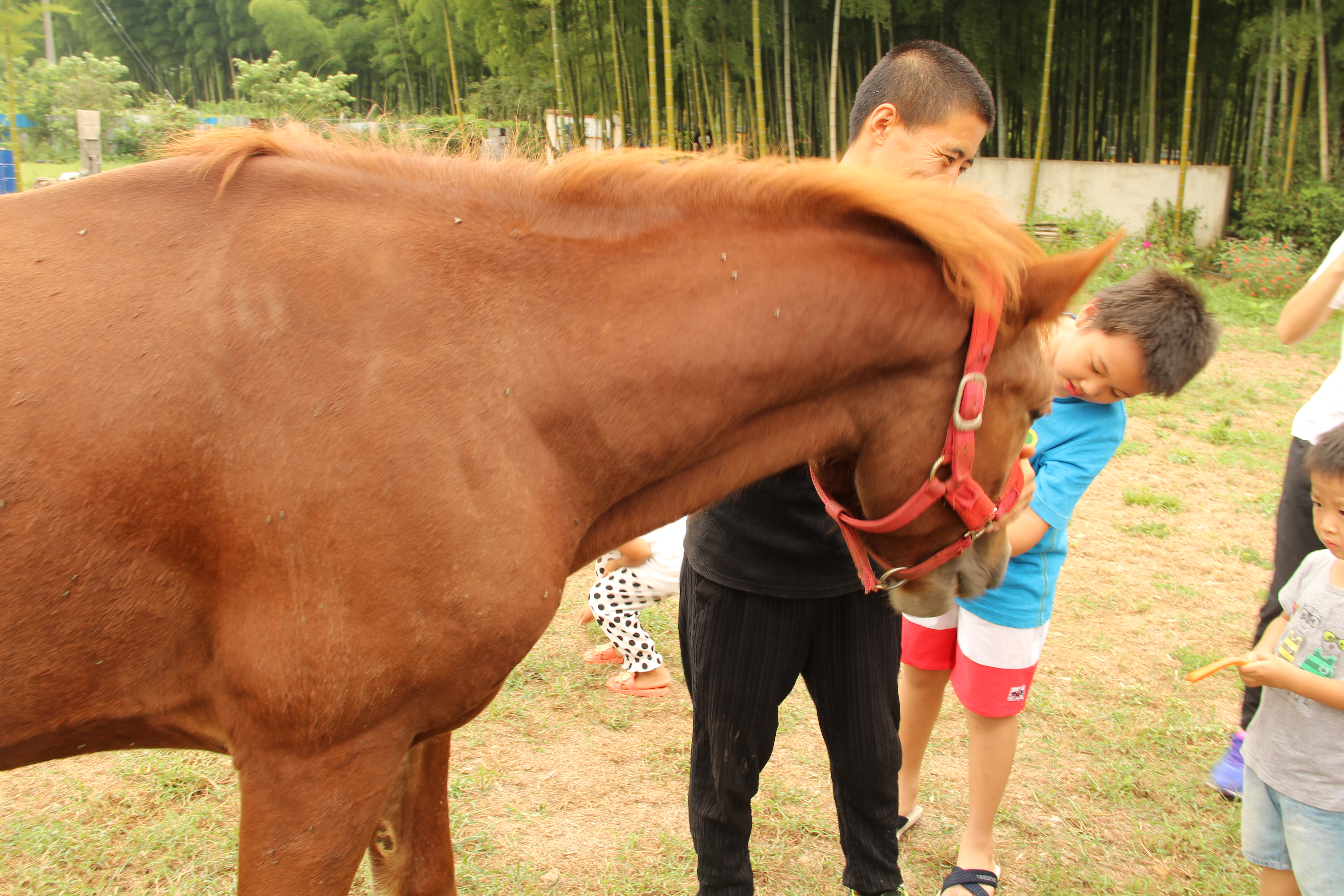 一开始,咱家娃有点怕怕的,躲在老板后面看老板给马喂食物。