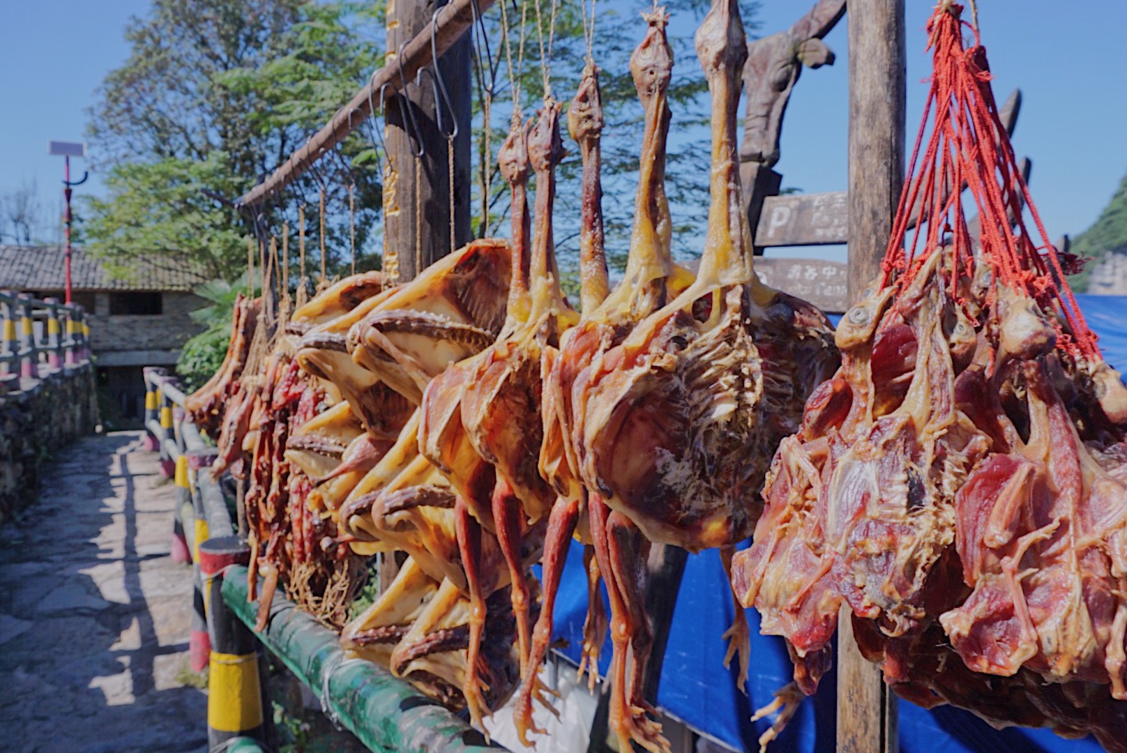 竹子上晾挂着的这些叫“知足”、“富足”,在广东用来煲汤、煲糖水或者凉拌都好好吃的哦!听说是这里的特产,晚上的时候我们偶然间吃到,才发觉这里的“富足”特别的好吃!真后悔没有买一点回来!