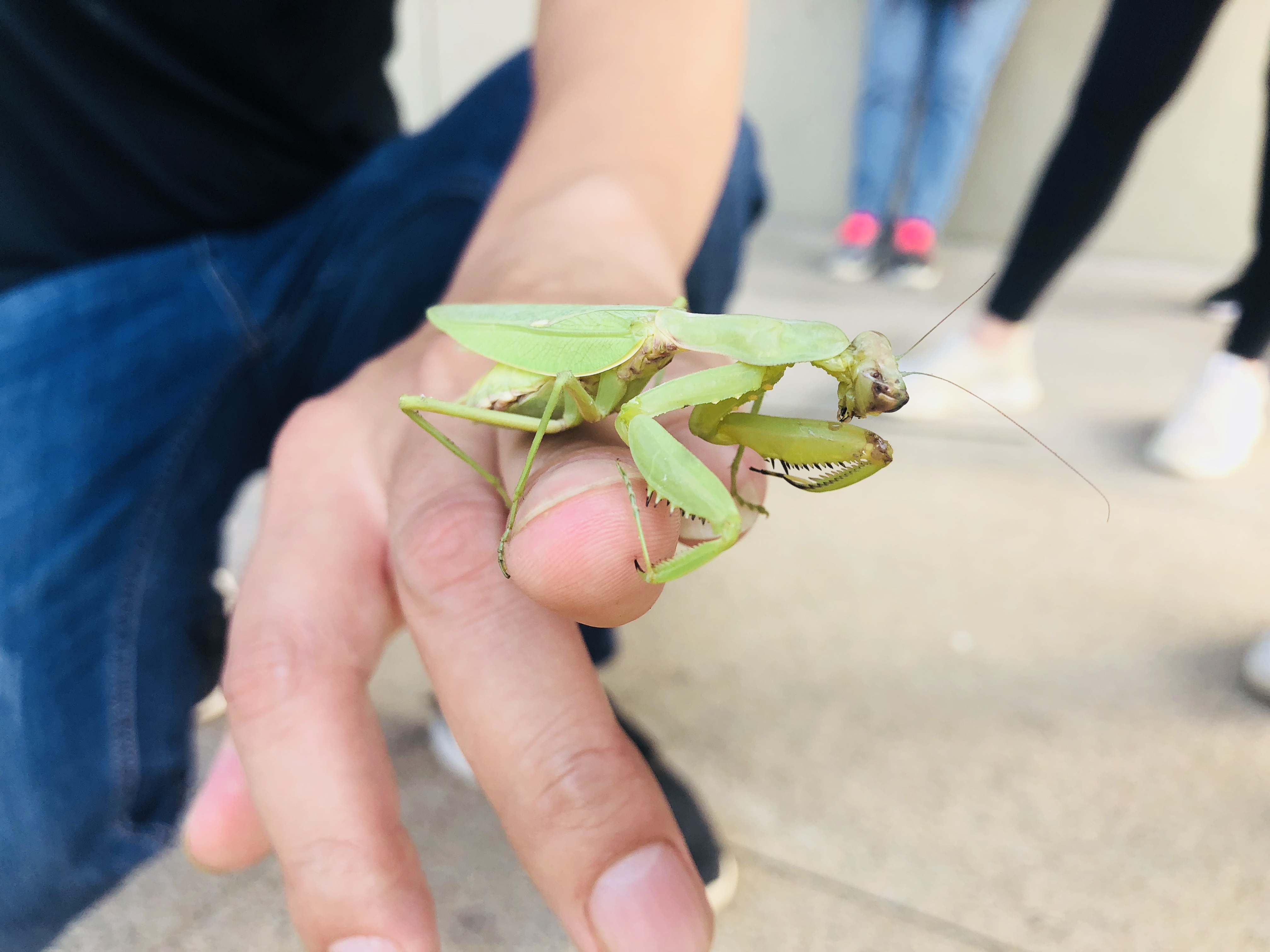 大人发现了螳螂,小朋友纷纷围过来!很好奇!