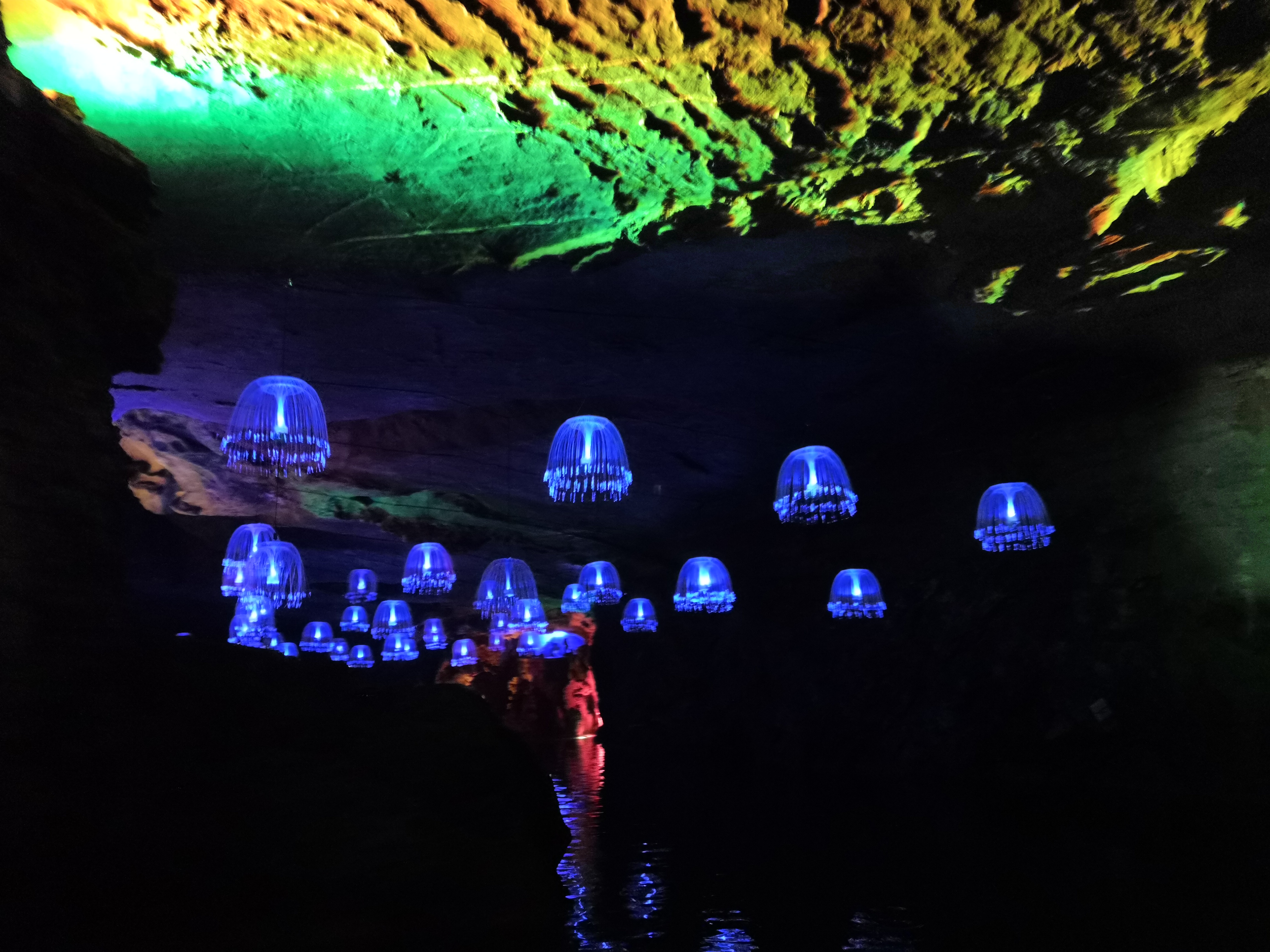 暗河内是典型的喀斯特地貌,常年恒温18度,长达千米的地下暗河,刚好可以行船,头顶是彩色灯光勾勒的钟乳石,造型千奇百怪,整个体验奇妙又惊险。