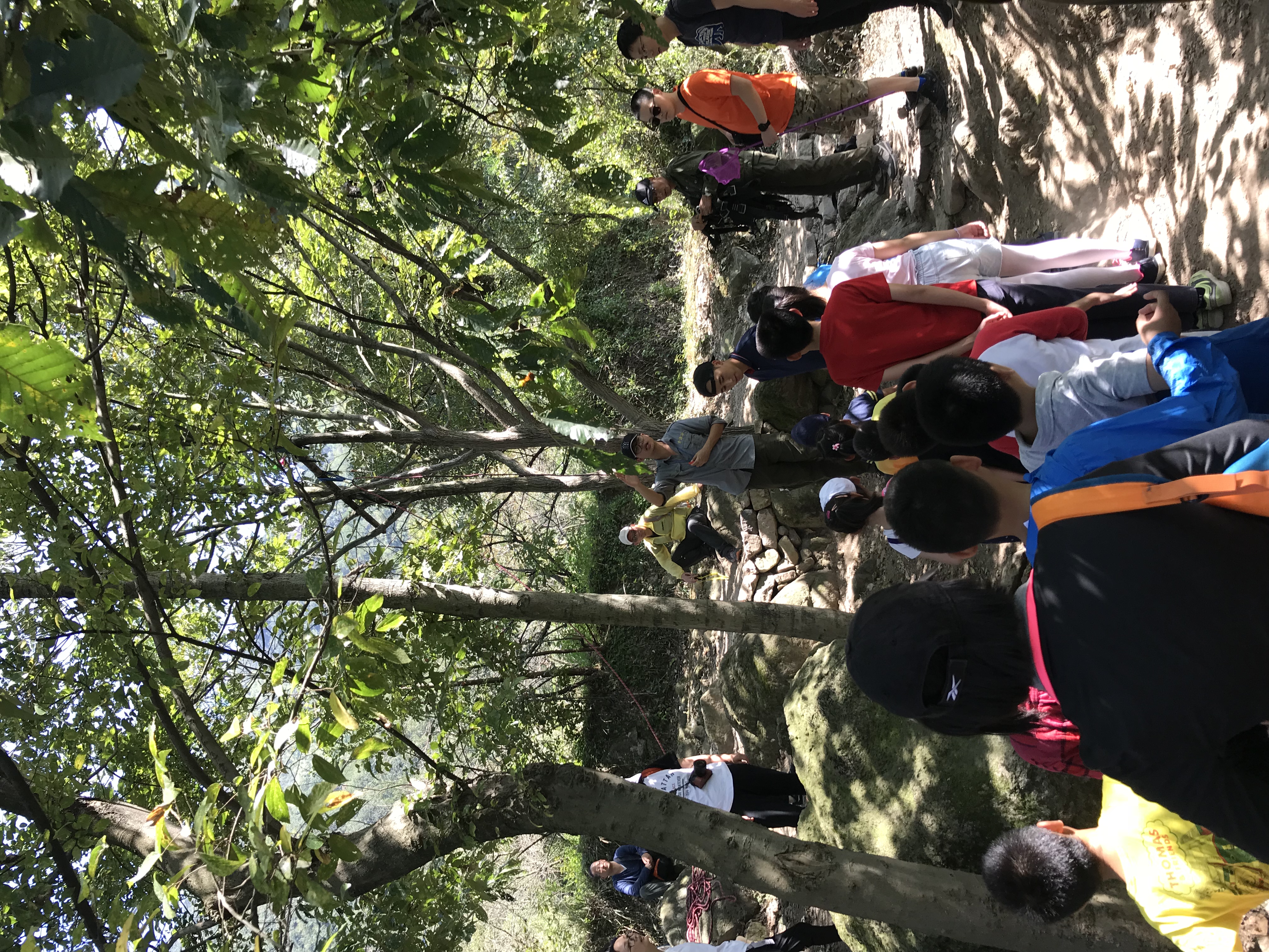 大约步行1公里左右,看见一个神秘的洞口出现在眼前,这就是传说的金牛洞,是山中天然形成的洞穴,整个山洞的长度大约100m左右,里面黑漆漆,还伴有潺潺的水流声,家长和孩子们手拉手,摸索着往前走;洞内无比清凉,常年温度在18度左右,再往里走一段,会豁然开朗,巨大的洞穴开了一条缝,像“天眼”一样。惊叹大自然的鬼斧神工,小歇一会,手脚并用,体验攀爬,到达了出口的位置。