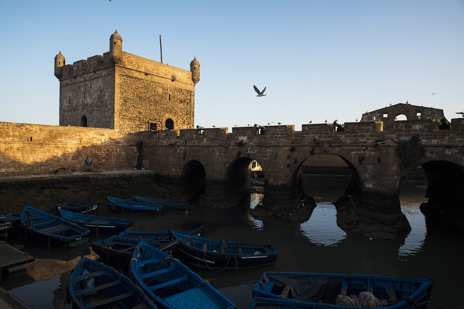 我们行程的第一站---索维拉 。滨临大西洋,有古城堡,炮塔,热闹的鱼市,数不清的海鸥追逐着渔船追逐着人。被称为摩洛哥第一日落。我们到时正好是中秋,东西方太阳和月亮遥遥相望。礁石上有人不顾涨潮的危险在钓鱼。
