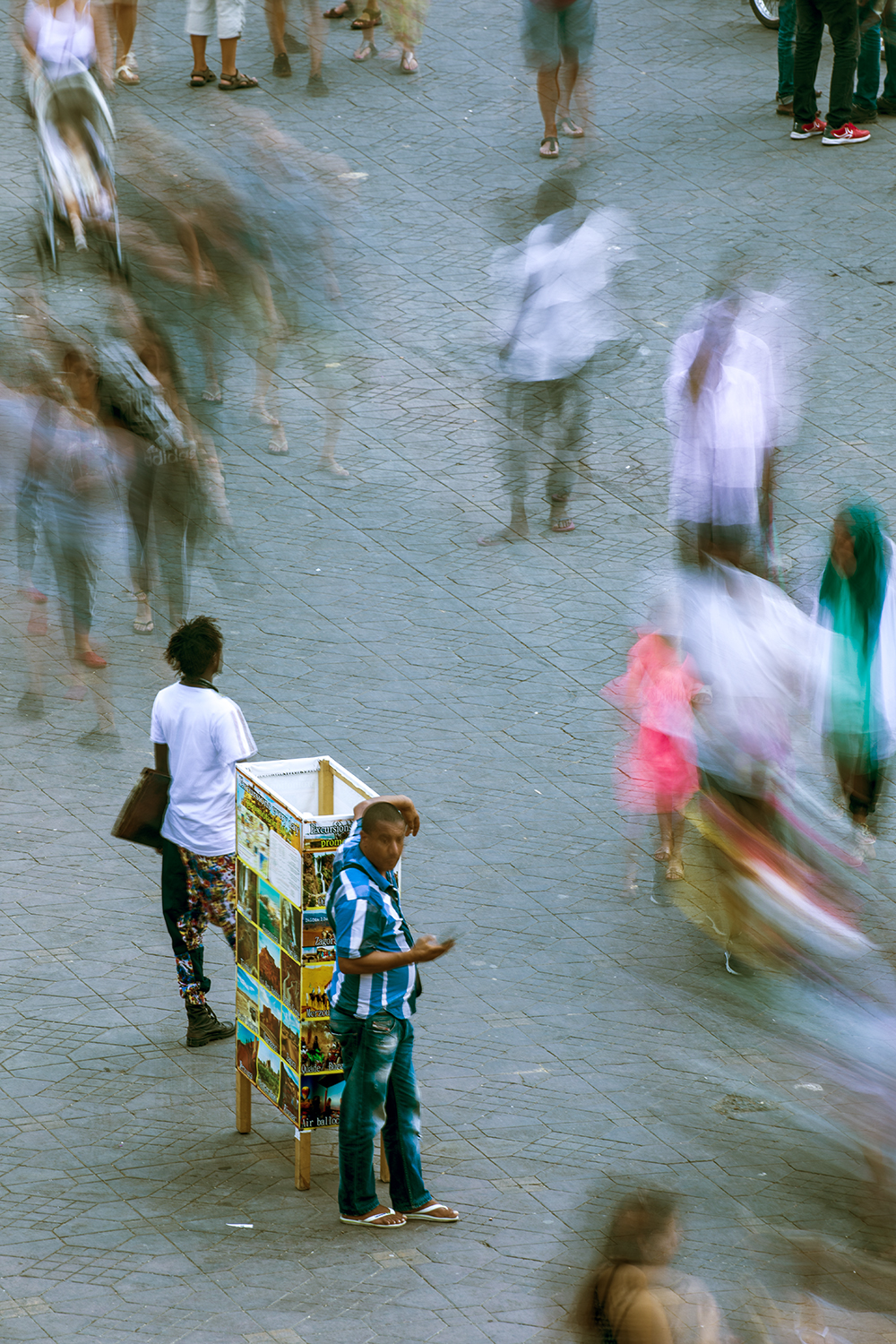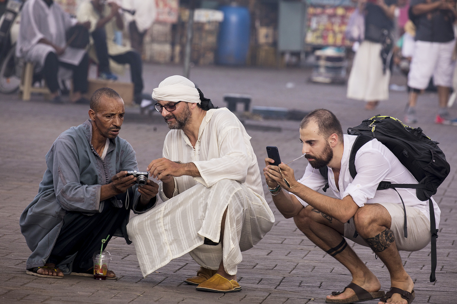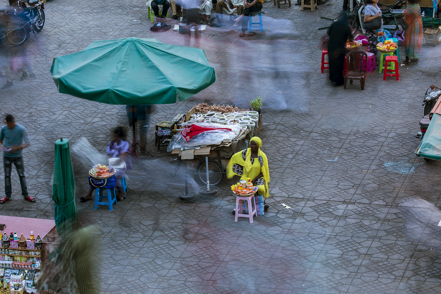 D2,马拉喀什。下午到达马拉喀什,游览了巴西亚宫,伊夫圣洛朗私人花园后到达不眠广场,找了一家餐厅各自买了饮料占据了有利机位只等日落。不眠广场可拍人文的元素比较多:小商小贩(卖饮料,水果,服饰,皮革,陶瓷器皿等等),还有说书的(讲故事),算命的,卖艺的(舞蛇)经同意后拍好给一点钱一表谢意。是个扫街的好地方。