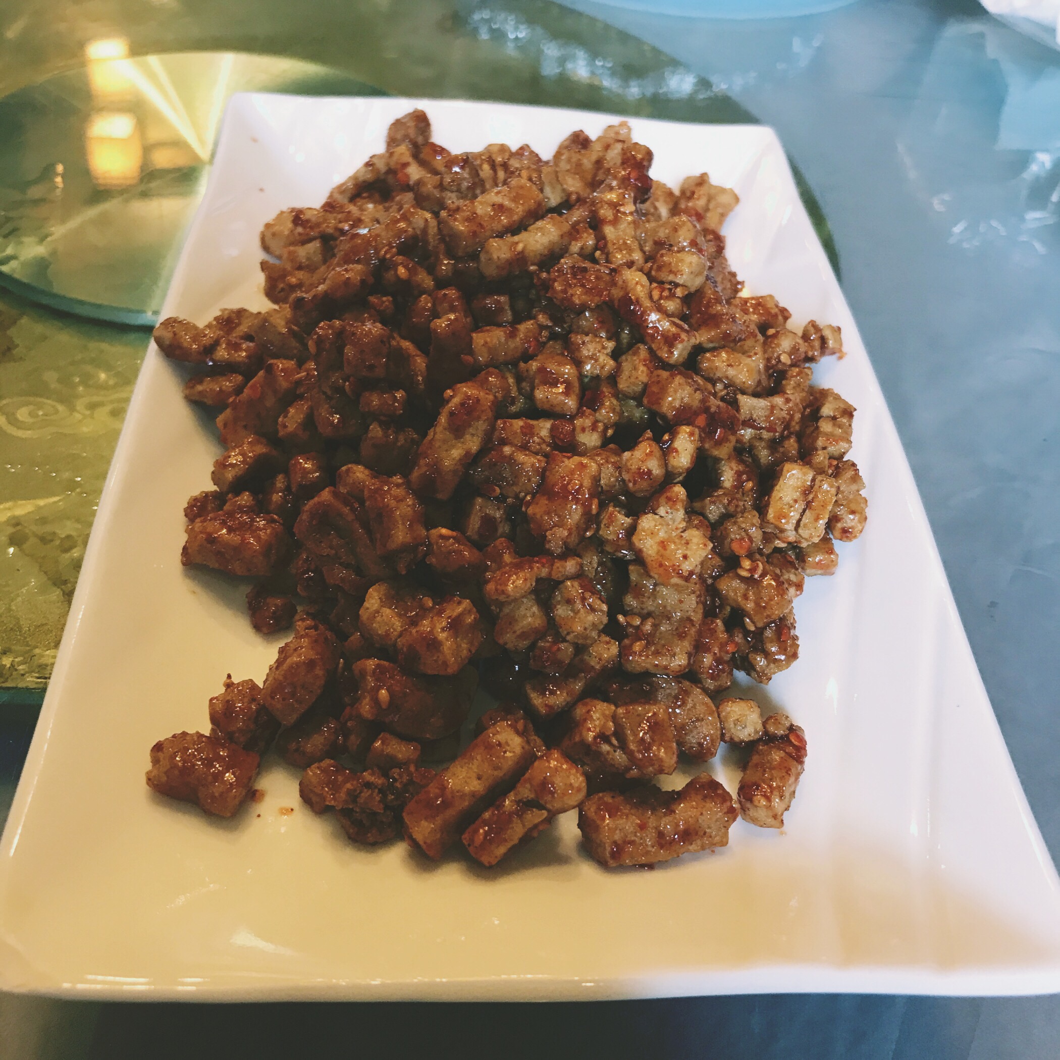 这个不知道叫什么名字,把豆腐切成小丁,炸得很干,再裹一层酱,很脆,下酒不错