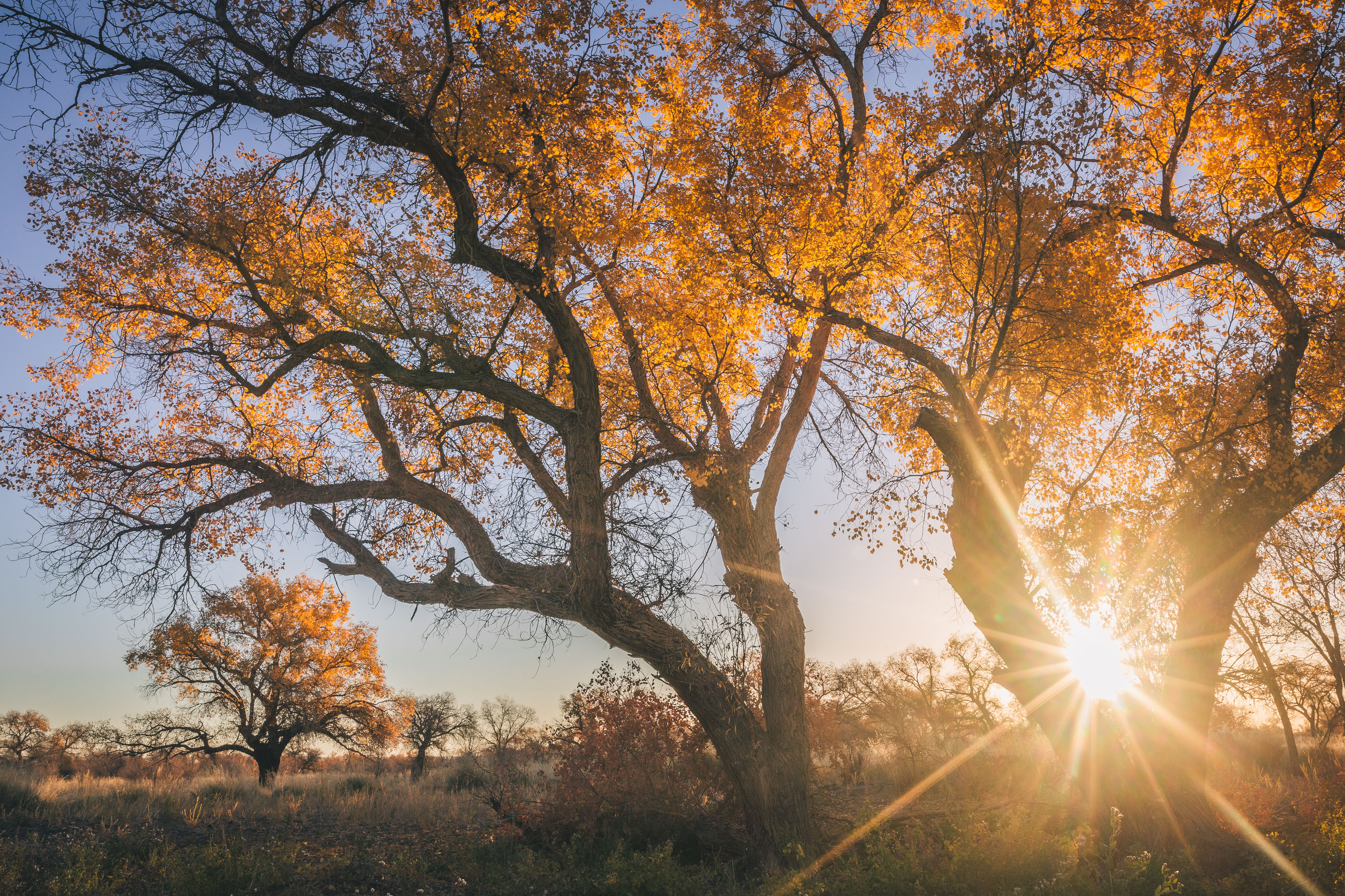 虽然这里的胡杨树还没有达到几百年的树龄,但是胡杨树生来自带奇特的树枝,饱满的树形,金黄的秋叶,还是能拍不少的。