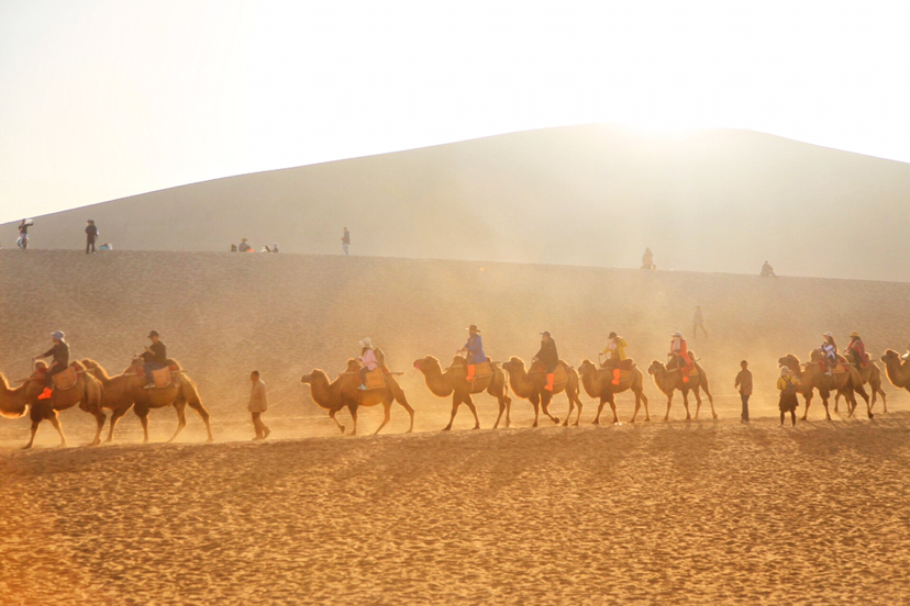 风吹驼铃声在沙漠中,看着驼队的影子在沙漠中渐行渐远,这一切一切若是千百年前,也是开辟丝绸之路出使西域的驼队。