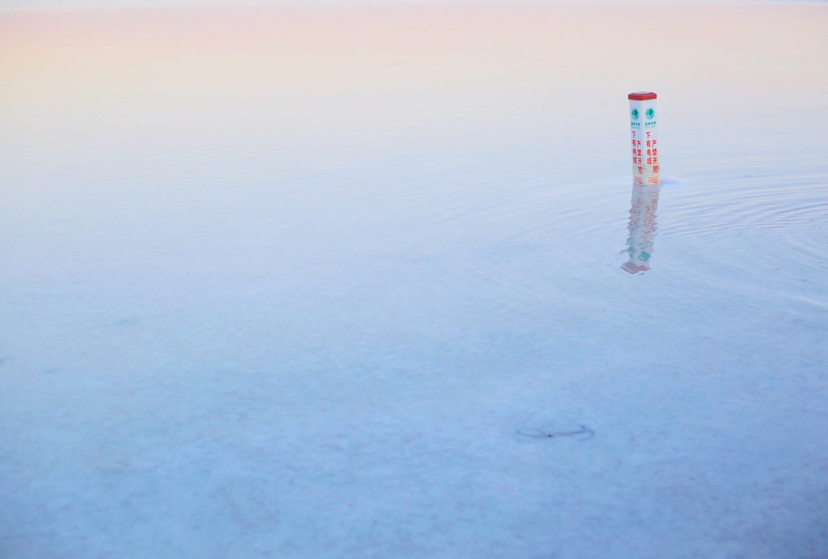 在太阳完全落下去后,在天空之境,也就是查看水面最浅,盐层几乎露在水面的区域,完全可以看到盐层的白色,放眼望去,是整块白色背景,非常美丽。