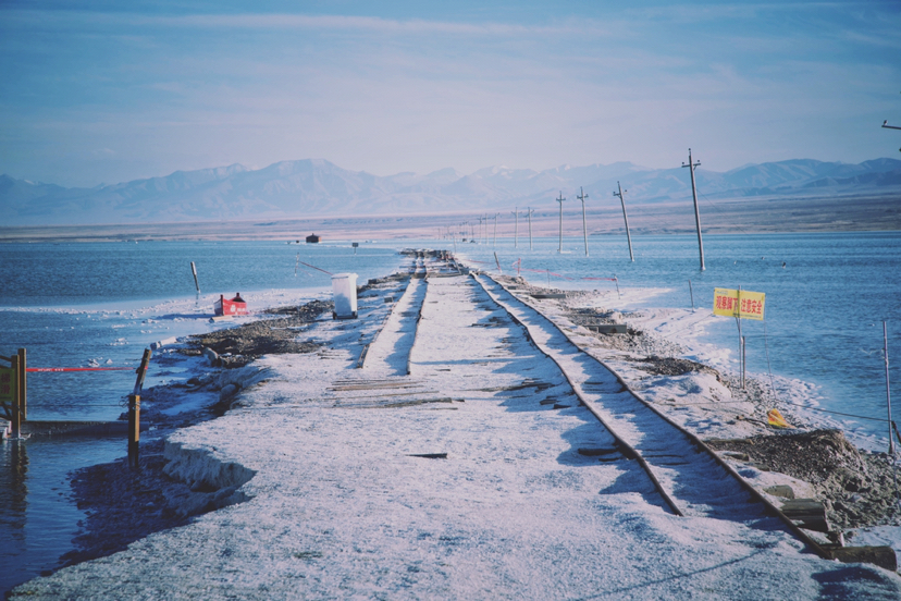日落时分,茶卡的小火车驶向盐湖中心位置。