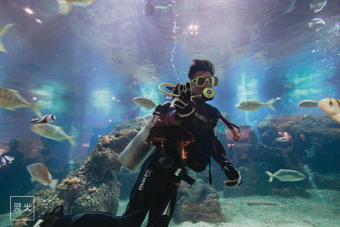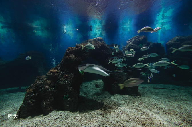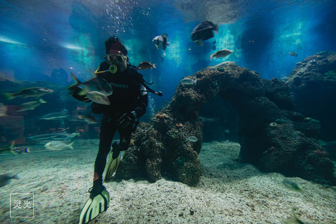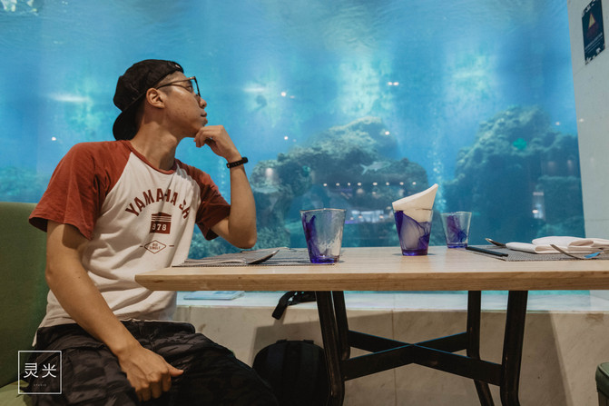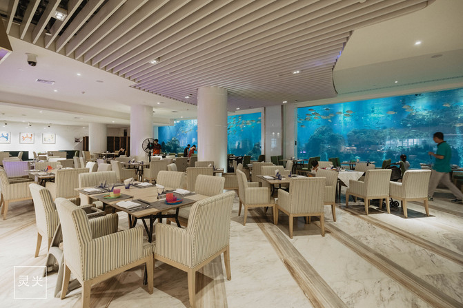 Ocean Blue海洋主题餐厅位于三亚亚龙湾迎宾馆一层,酒店于2016年初开业,海蓝餐厅由连接屋顶的巨幅玻璃幕墙组成。每晚7点30分,专业潜水员将潜入巨型鱼缸,表演喂鱼秀。可以一边享受饕餮大餐一边观赏喂鱼表演,一场美轮美奂的视觉盛宴正在上演。