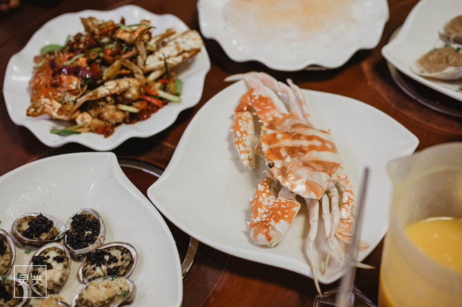 我买了大概10种海鲜,澳龙、花蟹、蓝蟹、明虾、象鼻蚌、鲍鱼、扇贝等等。很丰盛的一桌只花了400多元,算上加工费200多元这一桌够四人吃的海鲜大餐花费大概700元。是不是超便宜!!!
