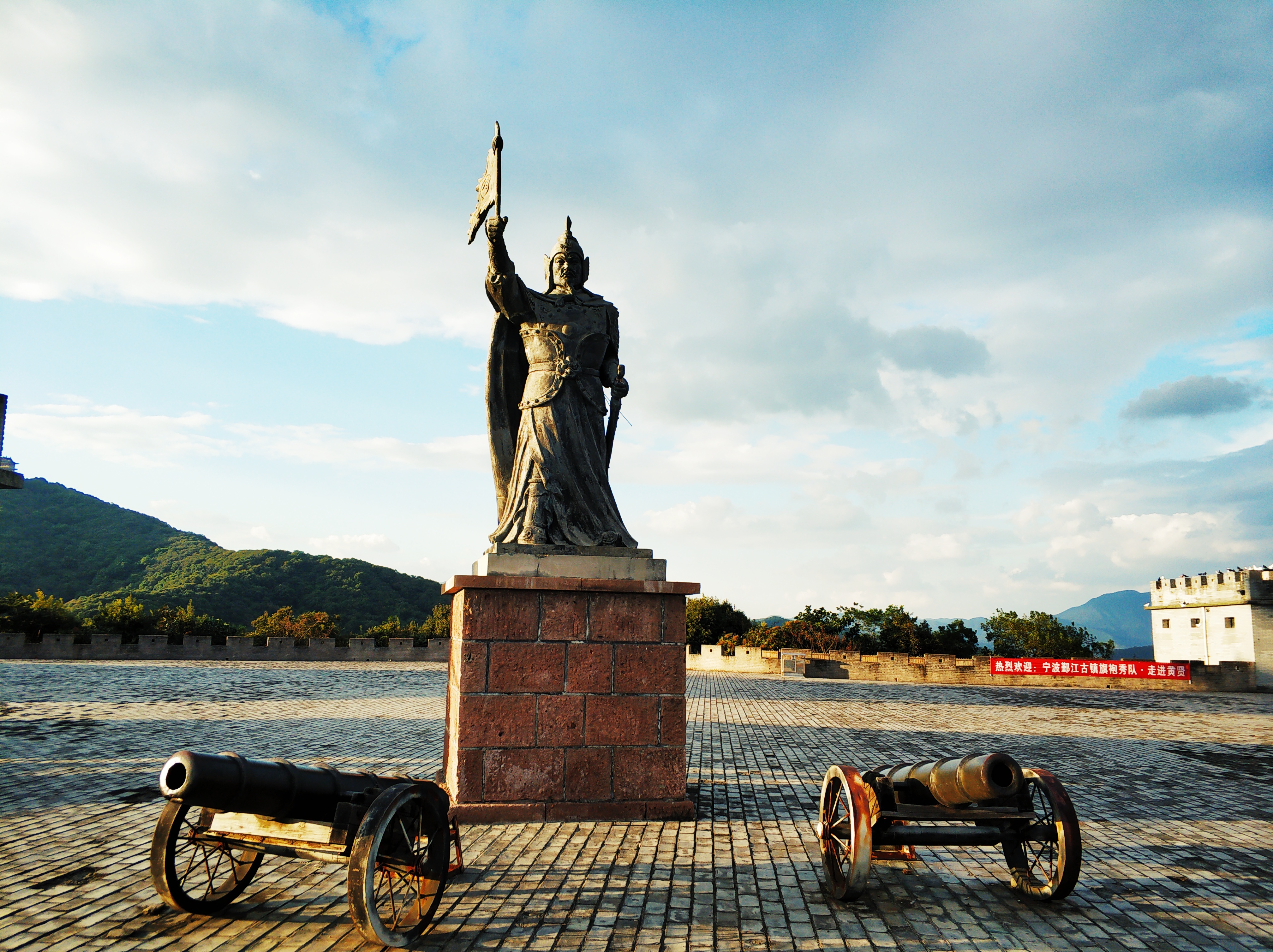 穿过雄关,眼前是一个偌大的广场,这就是著名的“戚继光广场”。广场正中央有一座雕塑,他就是抗倭名将戚继光。他身穿战袍,足蹬战靴,腰挎宝剑,手举令旗,目光炯炯地望着前方,仿佛指挥着身后的千军万马,誓为诛杀敌寇而作殊死拼搏。