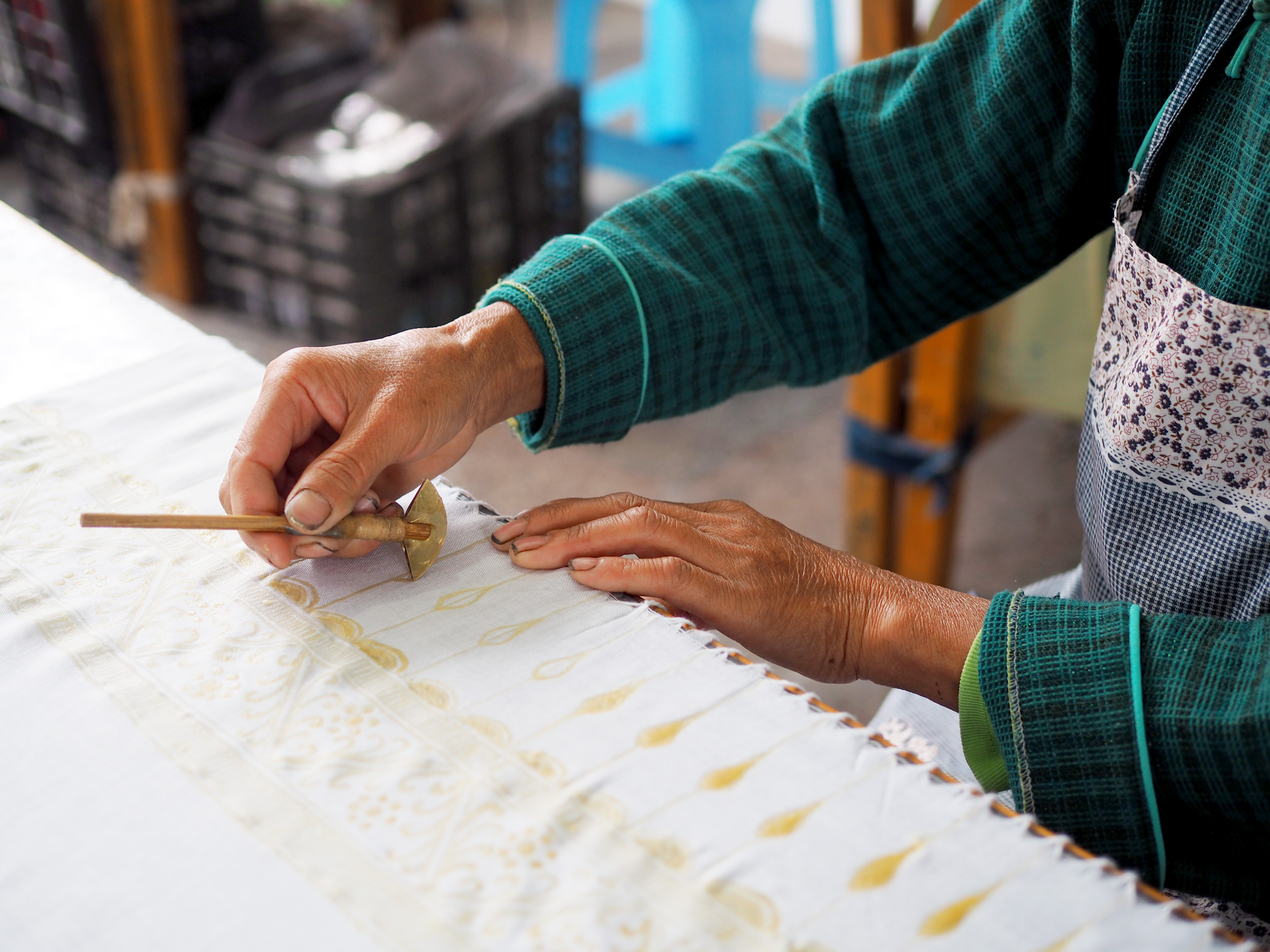 蜡染,是传统民间印染工艺之一。是一种以蜡为防染材料进行防染的传统手工印染技艺。贵州苗族、布依族等民族擅长蜡染。蜡染是用蜡刀蘸熔蜡绘花于布后以蓝靛浸染,既染去蜡,布面就呈现出蓝底白花或白底蓝花的多种图案,同时,在浸染中,作为防染剂的蜡自然龟裂,使布面呈现特殊的“冰纹”。
