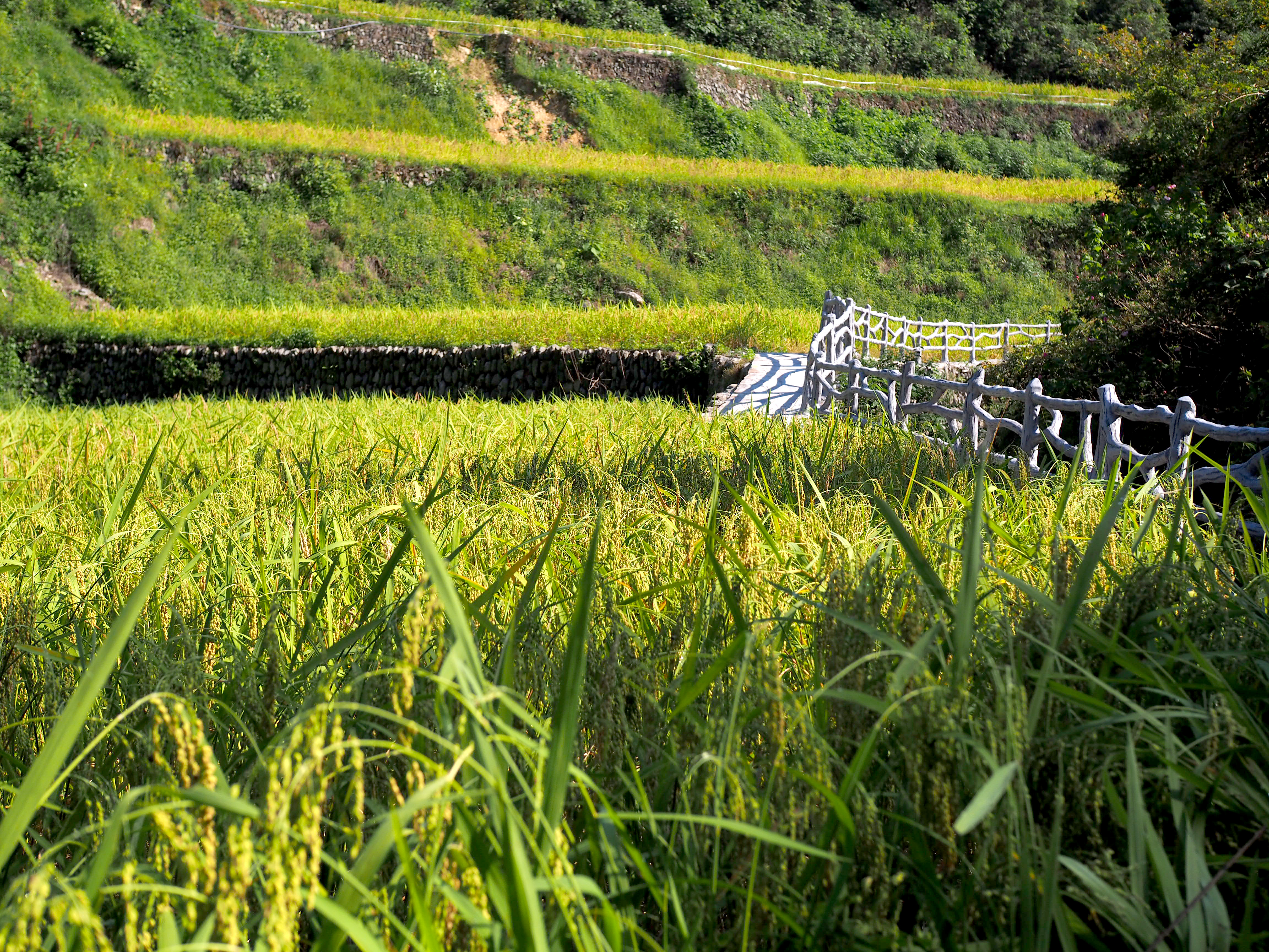 肇兴的打卡方式很多,早起徒步是不可错过的,坐车上山,徒步下山,行走在梯田的边缘,青石板路很明显。峰回路转又是一个新的画面。