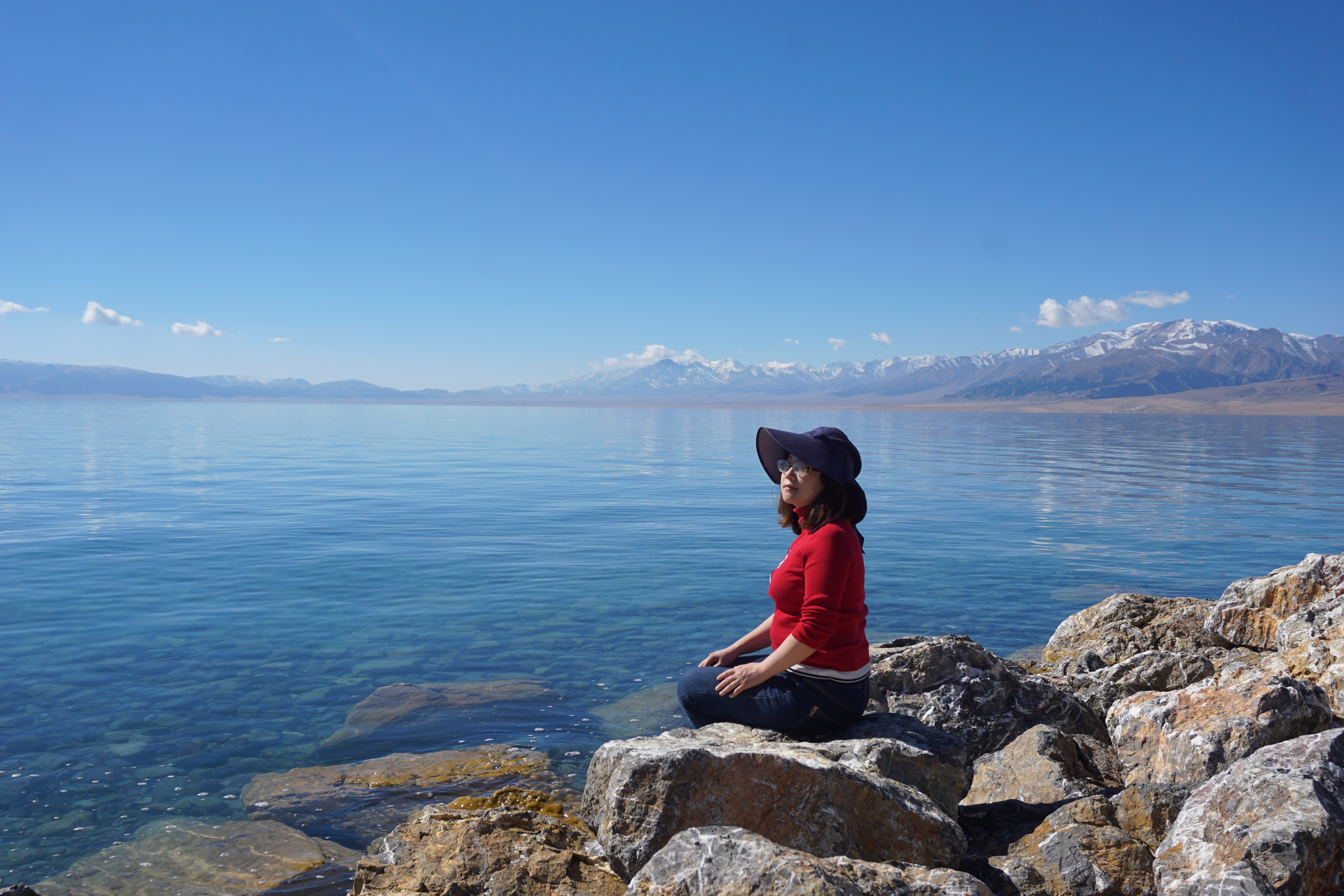 这个季节的赛湖真的很美,远处是雪山,近处是清澈的湖水,是一种说不出的蓝色,并非夜幕降临的湛蓝,也非天空的蔚蓝,很像一汪浅海水域,却又深不见底,又像泪眼盈眶的碧绿眼眸,呼之欲出之感!而我在这一刻,解开自己久违的矜持,在湖边肆意的撒开了欢儿........