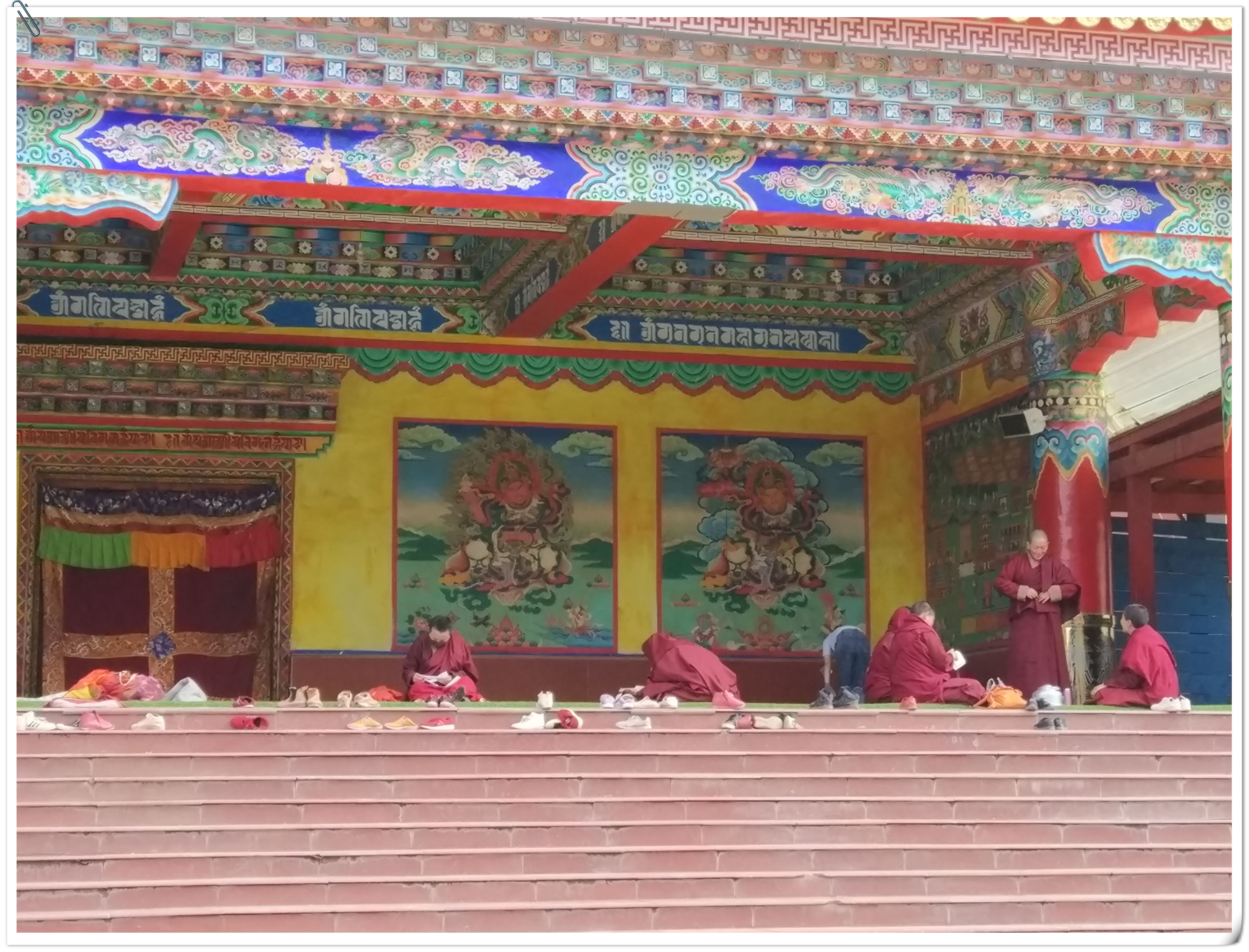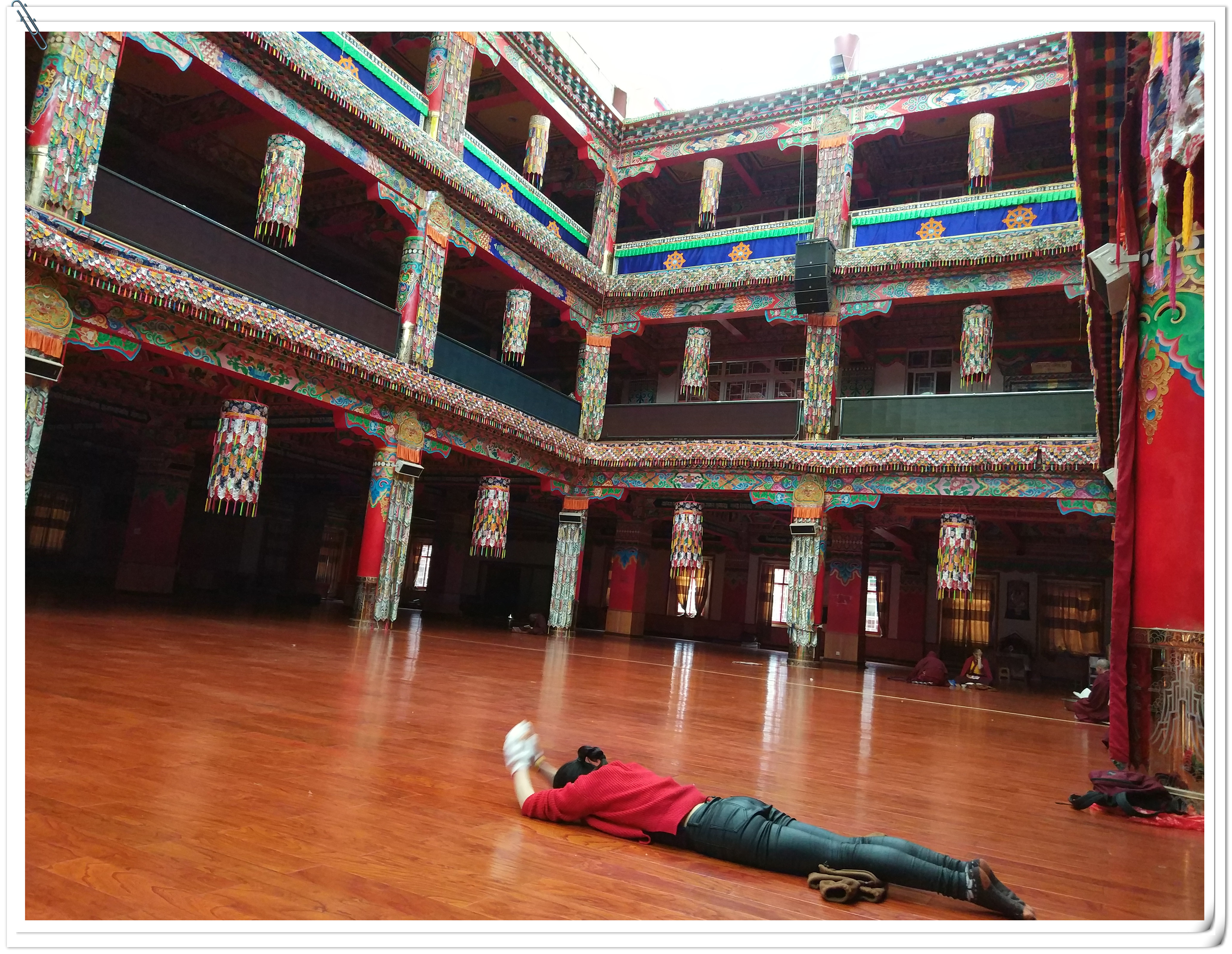 学院里最宏伟的建筑就是经堂了,那里存放着太多人的信仰。门口铺着绿色的地毯,宛如青青地草原。两边都有供僧侣游人摆放鞋子的地方。脱鞋,赤脚轻轻迈进佛学院的大殿,看到有一些小觉姆盘膝坐在地板上,双手紧紧捧着经文在低声诵读。我微笑着对她点头,她却羞涩的把头深深的埋进手 中的经书里。
