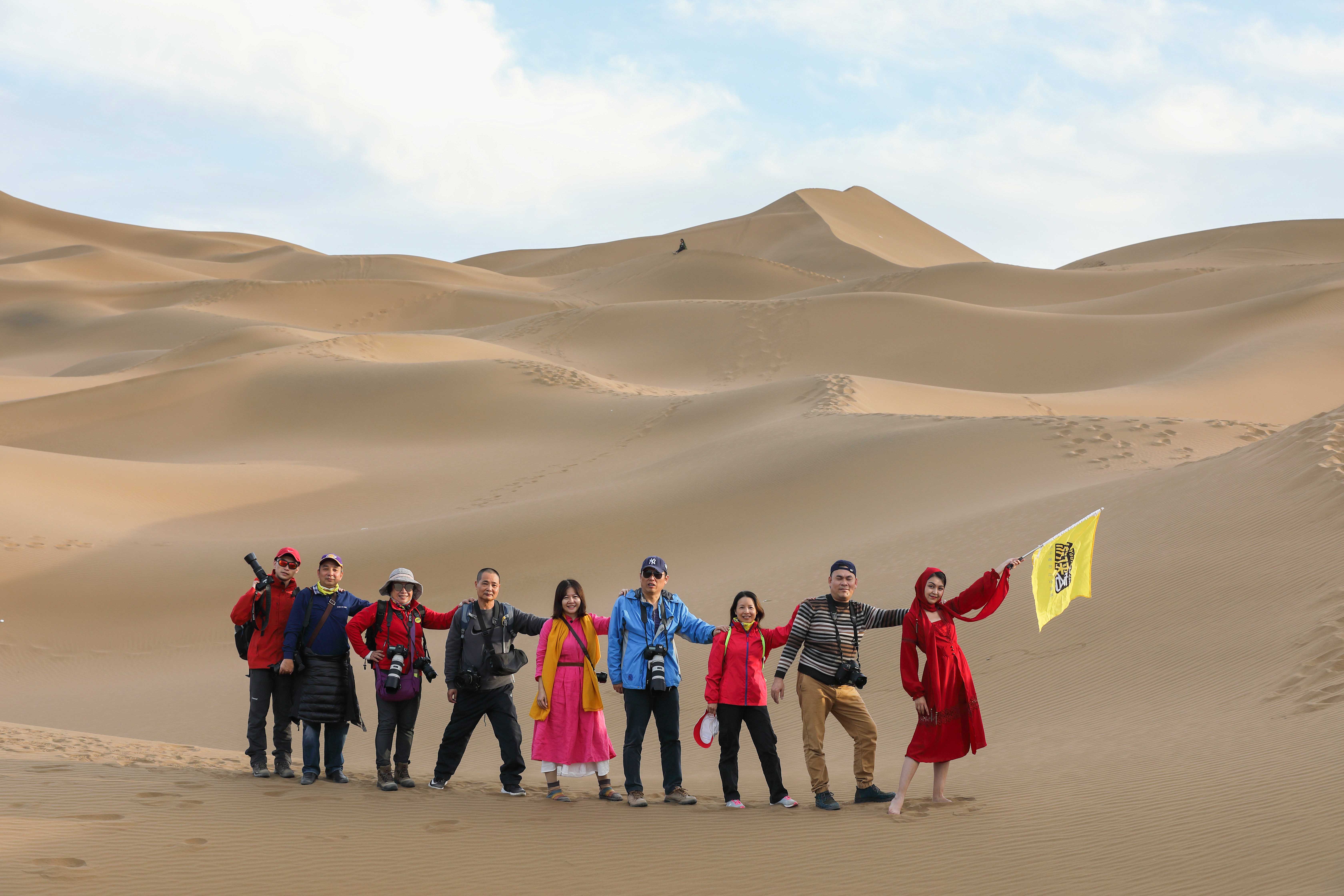 在库木塔格沙漠合影,大林跑到沙漠顶上了,也算是合影全了,哈哈