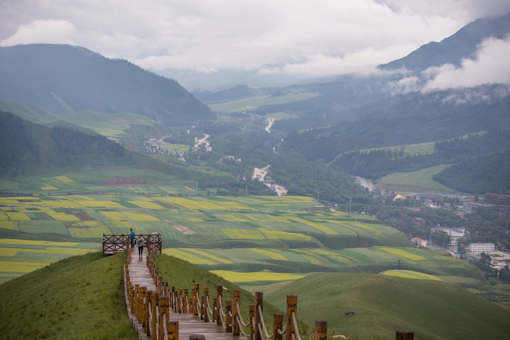 七月的青海正是油菜花开的季节,卓尔山下也有大片的油菜花田,从山上俯瞰,黄绿相间的大地色彩鲜明,天空飘荡着雨后的云雾,宛若仙境。