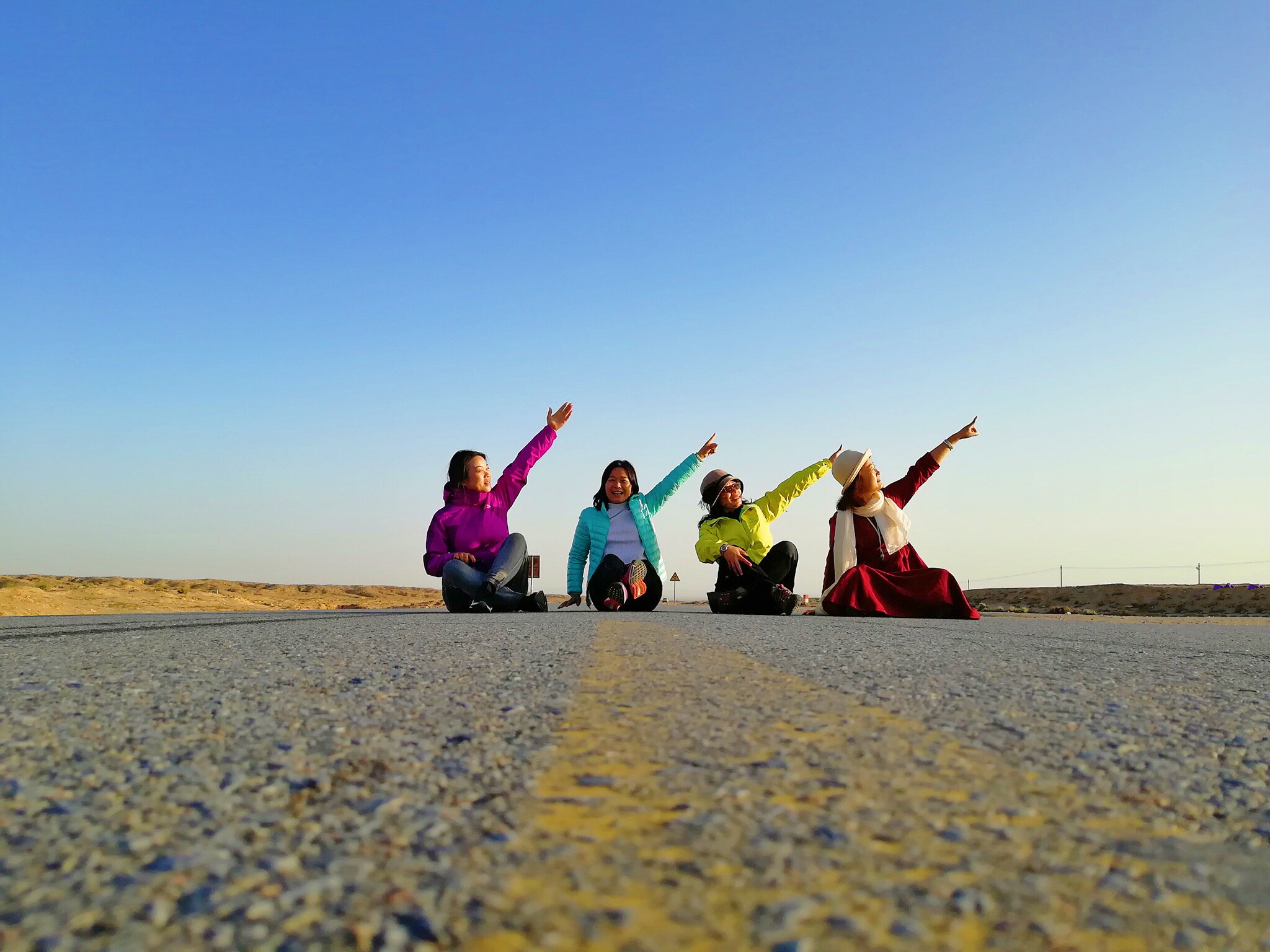 虽然知道大路中间拍照很危险,但南方来的伙伴们对这大漠戈壁中的笔直公路爱得深沉啊!冒险也要拍几张(当然,我们两头都有专人看车准备预告的哦)
