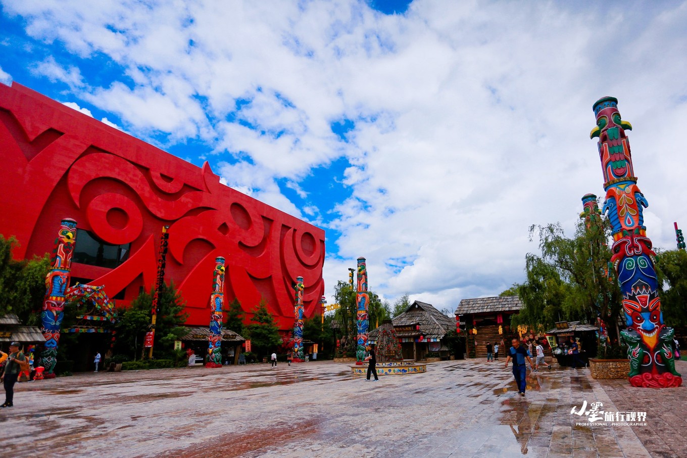 这座全世界最大的东巴文化主题剧场,剧院外观以红色基调为主,在蓝天白云间显得格外耀眼。建筑外形的设计运用了一些纳西象形文字,表达了一对相恋的男女在太阳和月亮的注视下,在大自然中歌唱舞蹈,给人以美好却又神秘的遐想。