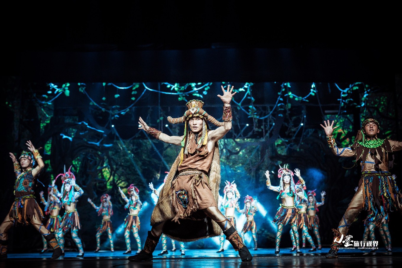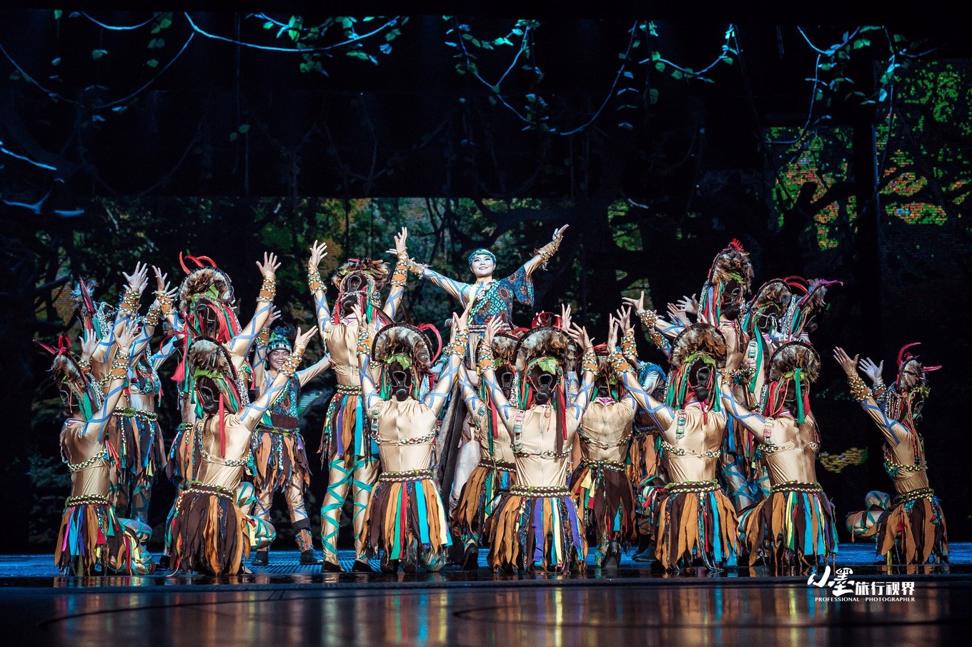 男人女人在森林里载歌载舞,突然间漫天洪水向他们席卷而来,人类在大自然的磅礴伟力面前显得是如此渺小脆弱,而当我以为就此结束时,周围却响起了阵阵热烈的掌声,一只从天而降的金丝鸟救起所有纳西人后又缓缓升起,舞动着翅膀,灵动而雄伟,旁边的小伙伴一直扯着我的衣服激动的说:“快看,快看啦,这只鸟是由人扮演的,太不可思议了。“是啊,如果不仔细看,哪能看出是一个由9个人组成的默契团队。那一刻,剧院里掌声如雷欢呼如潮,我相信,所有观众这一刻都被震撼到了。