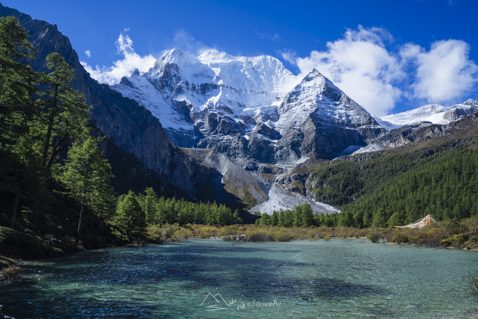 我们住的客栈在门口就可以看到夏诺多吉和仙乃日两座神山,但是都有被其他山体遮挡到。亚丁景区有两条徒步路线,长线是去到牛奶海五色海,短线是去到珍珠海。当然,三大神山也都可以看到。我们在景区的第一天是选择长线,每人背着20多斤的设备,到达洛绒牛场开始负重徒步。