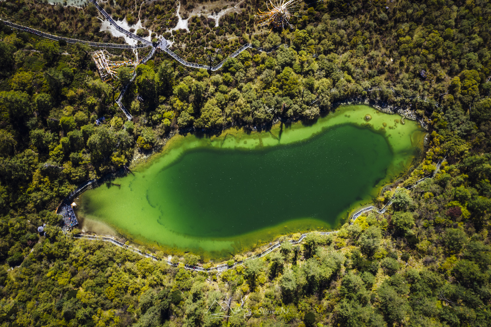 俯瞰五色海,会发现深蓝色部分水体居然是一个心形啊~听说到了冬天周边的水枯干,心形就会更加明显。