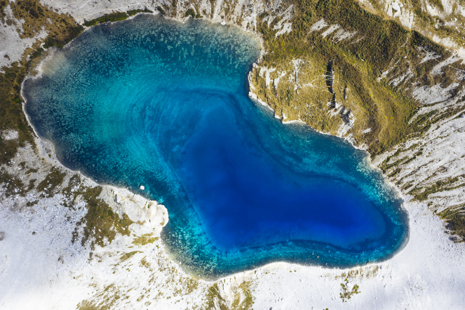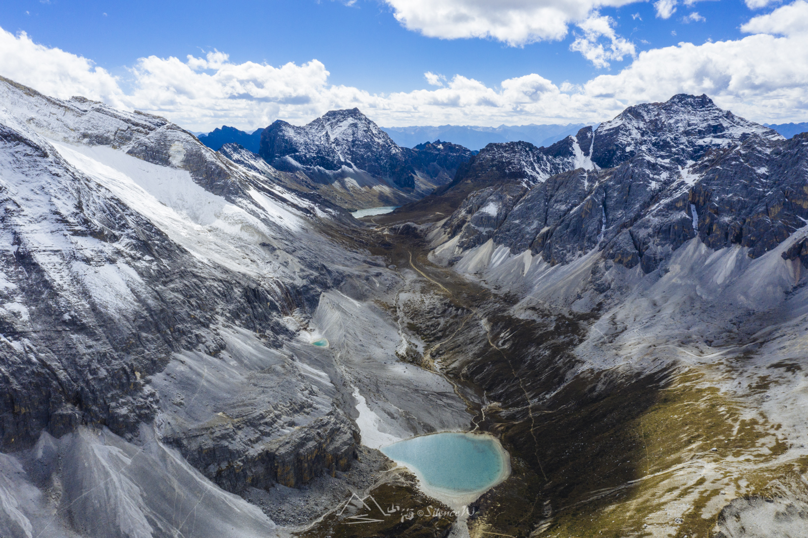 牛奶海,海拔4600米,在央迈勇的山坳里,呈扇贝形,中间是碧蓝的雪水,周边则是一圈乳白色环绕,这圈乳白色大致就是牛奶海名称的由来。从4700米的地方放飞无人机,到达5200米的海拔进行俯瞰,发现牛奶海上面还有一大一小两个未开发的湖泊。