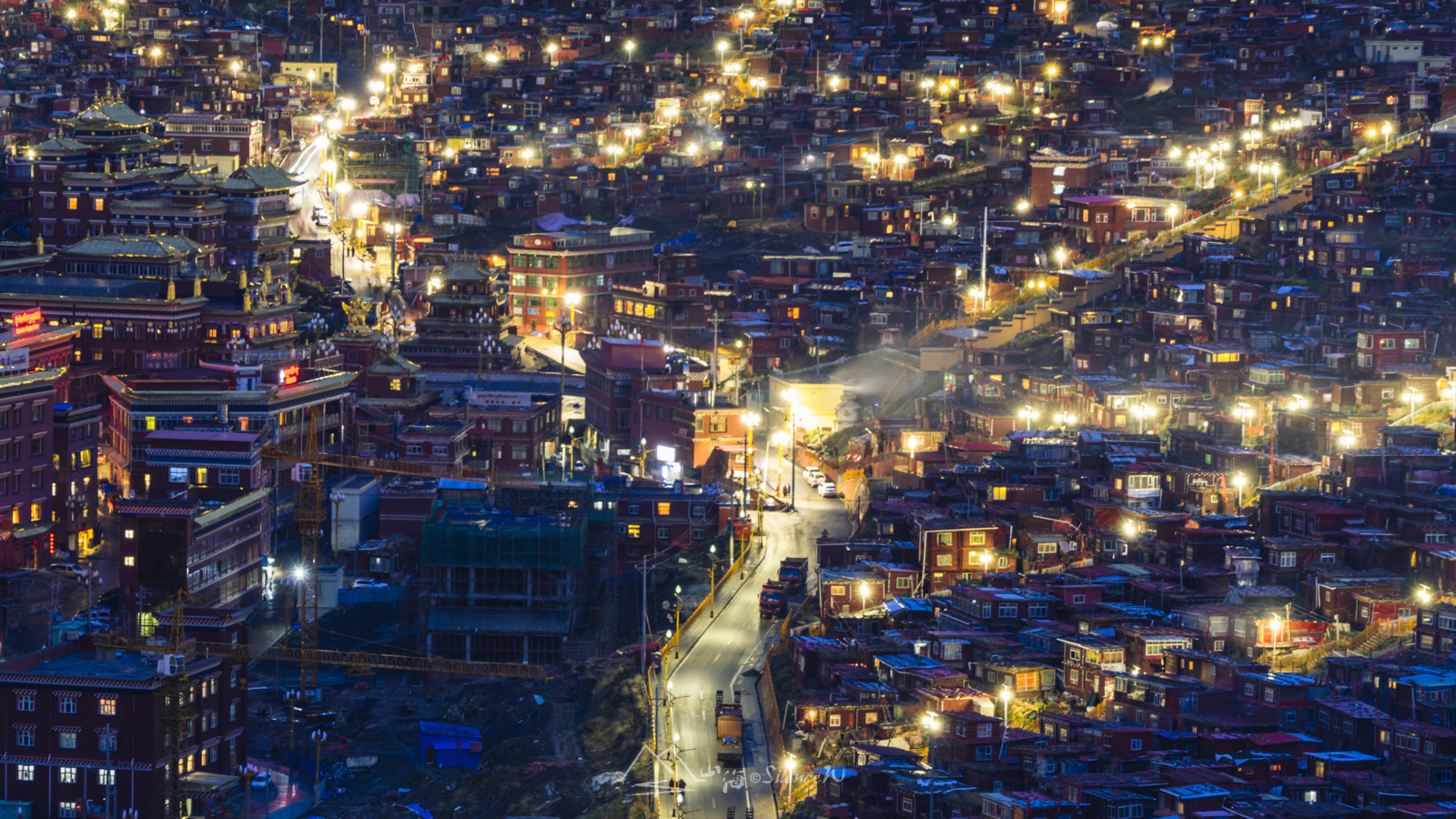 我们在山顶从下午等到了傍晚,中间有段时间下着雨夹雪,快被冻成雪条了。因为我有一部相机一直在拍延时摄影,时不时还需要把镜头前面的雨点擦干。到了华灯初上的时候,看到整个佛学院就如千与千寻的童话场景一般,一切的等待都是值得的。