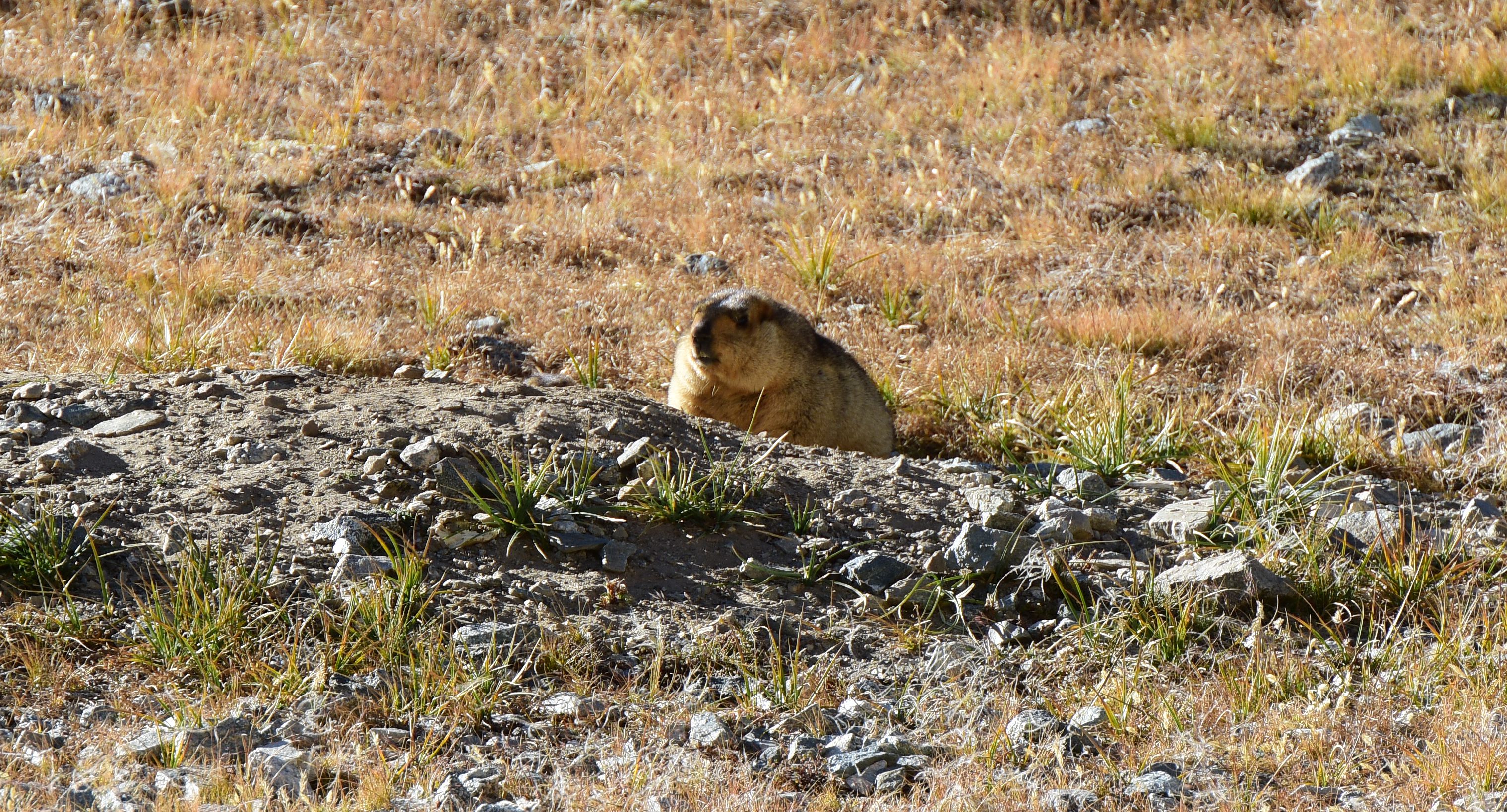 当仁青休布措离开了视野,我们才将视线转移到山坡上“搜寻”着是否有野生动物。浪漫的视力真是超好,她在岩石坡上发现了“大老鼠”。经指点,只见草丛里一只背对着我们象是坐着悠闲地晒太阳又好象是一个负责放哨的哨兵,摇晃着脑袋左右观望。那肥肥胖胖的小身子直接架着一颗小脑袋,没有颈部。它的体毛与身旁草的颜色非常相近,具有极强的自然隐蔽性,如不仔细辨认,很难一下子看到。后经彭师傅的纠正,才知道它叫旱獭,也叫土拨鼠。