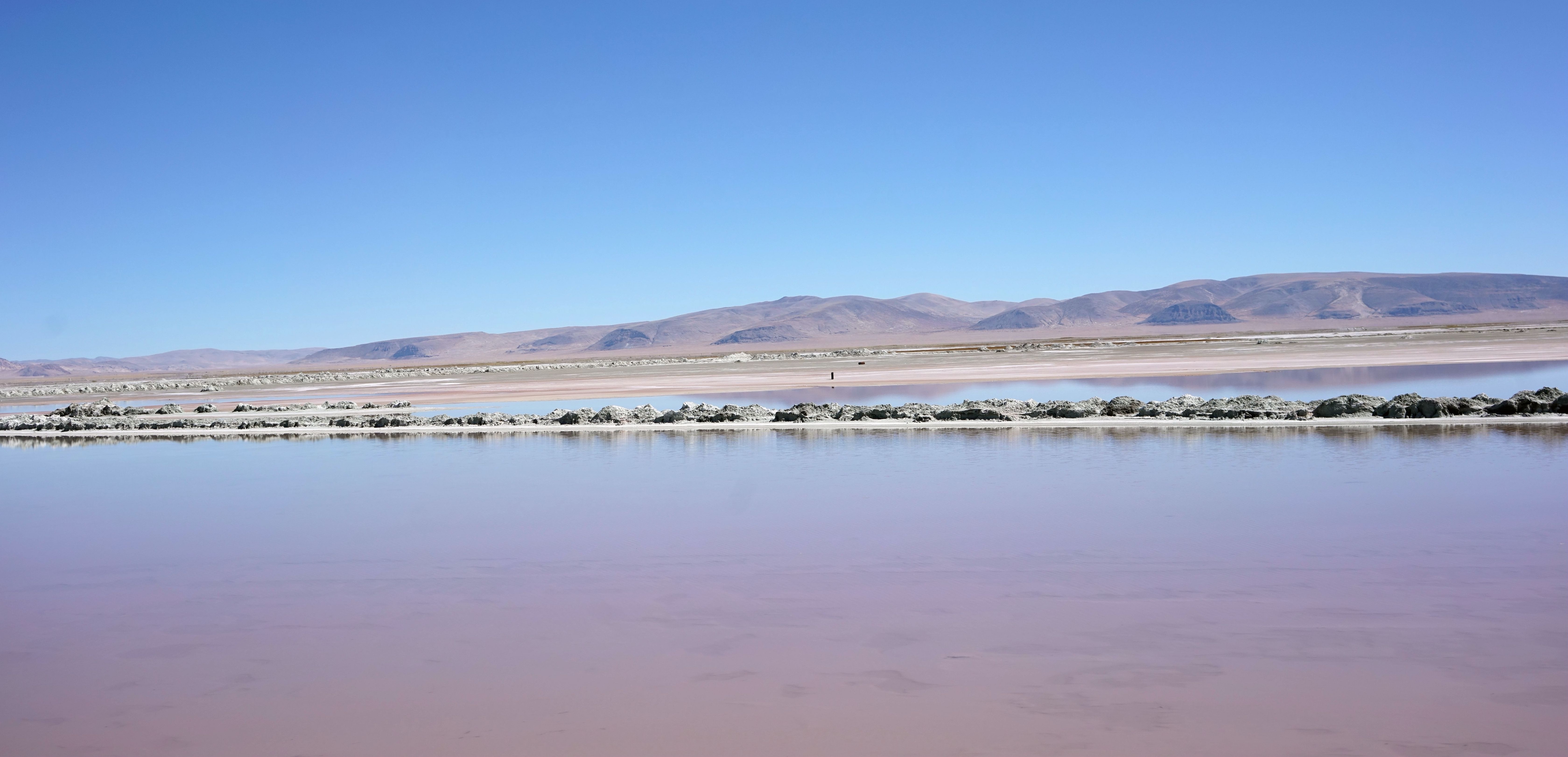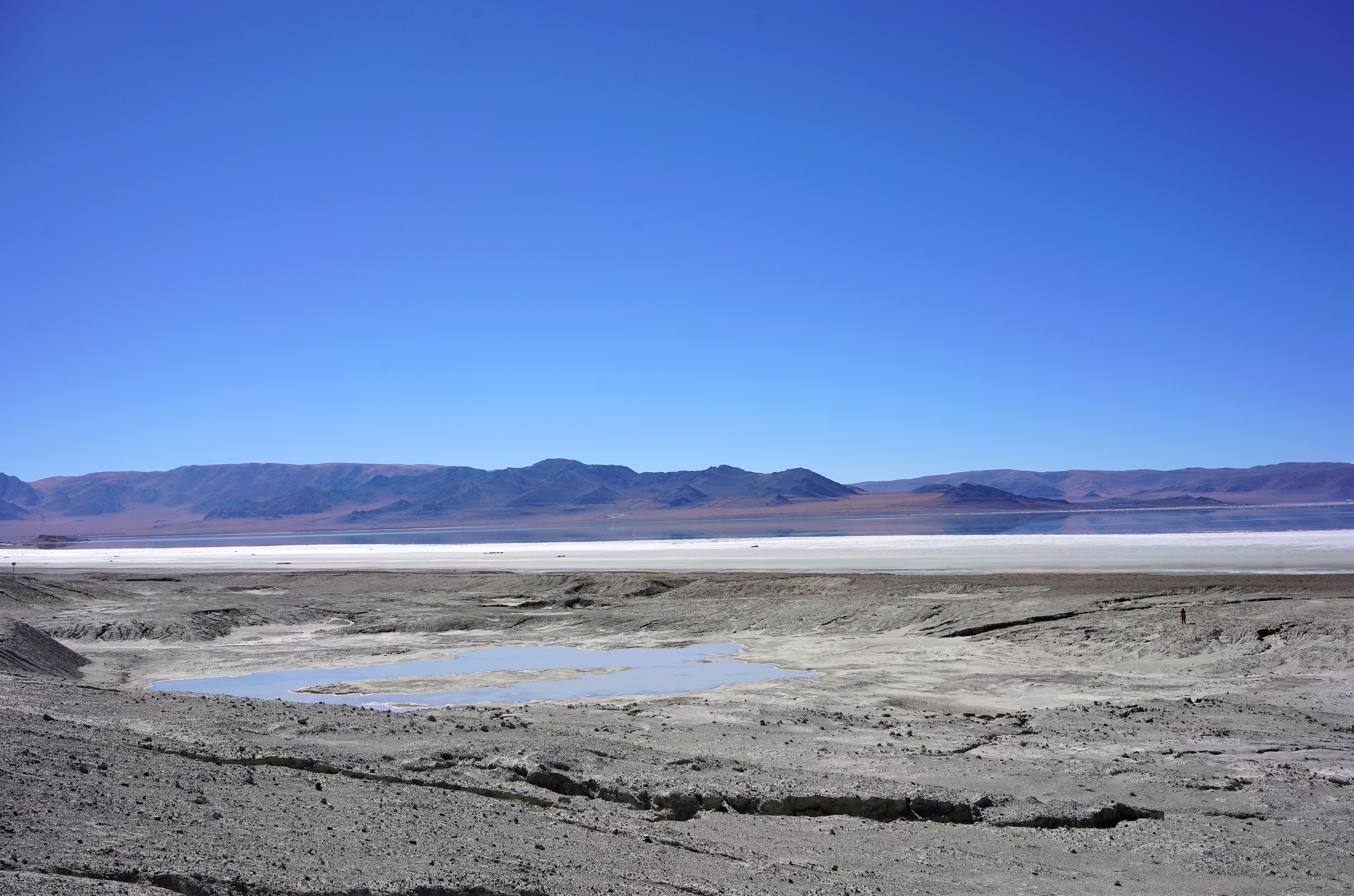 扎布耶措分南湖与北湖两部份,南湖固体与液体并存,北湖为卤水湖。我们现在所处的是北湖,旺旺说也有人称之为红湖。细看湖水是淡红的,是因为卤水湖是盐湖中常年保持有一层深度不大、矿化度很高的物质。