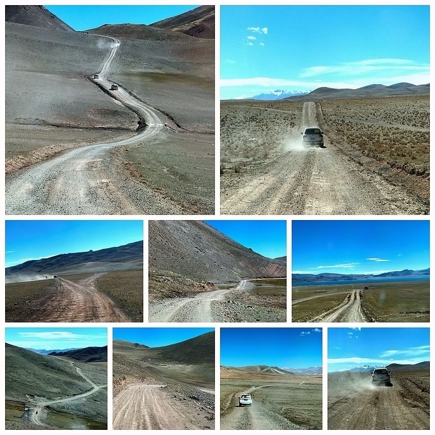 接下来又是碎石路,更艰险。上坡又下坡,坡度陡且高低不平更甚。我们6辆车在荒漠中行进,路上被我们拉起的尘烟雾蒙蒙一片。真佩服这些司机师傅,在这么难开且艰险的土路上自如开车,且能够准确地识别路的方向。走阿里线确实需要找当地有经验的司机,这样可避免路途中不可预知的风险。